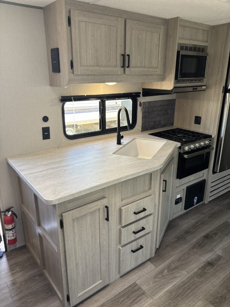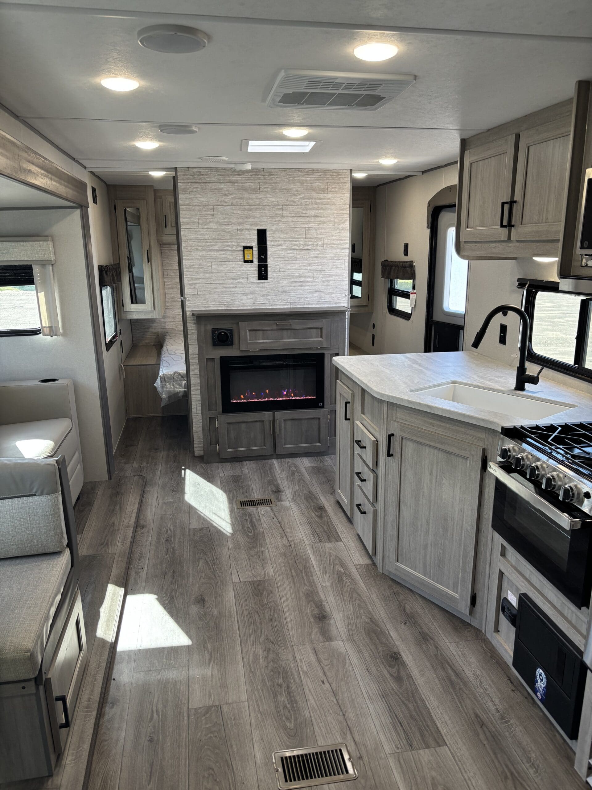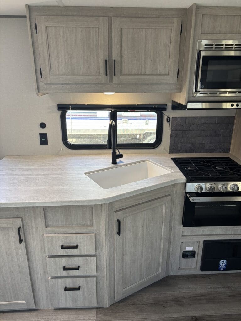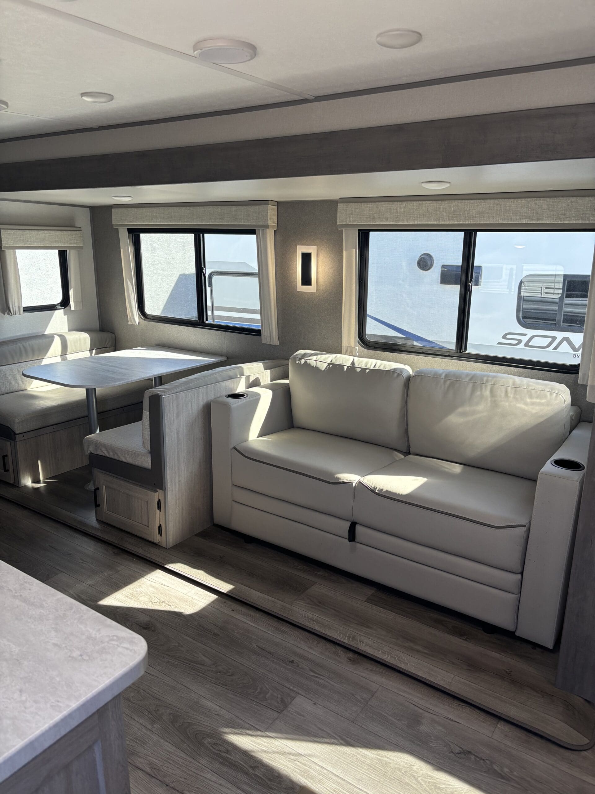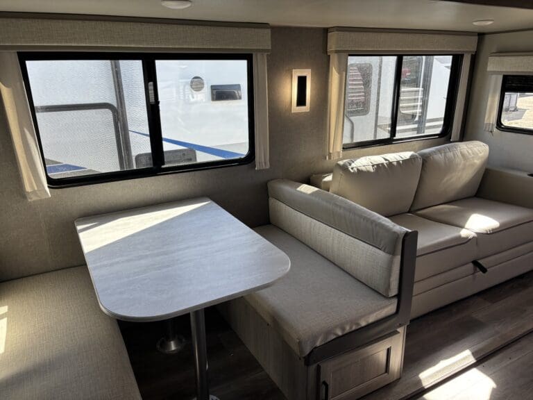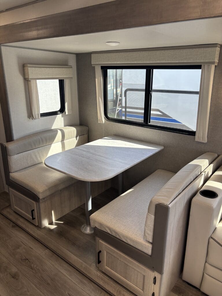 The popular 243RBS is the ideal couple’s coach! This floorplan boasts a full-size super slide with both a dinette and sofa, a spacious rear bathroom with a walk-in shower, extra-large pantry/wardrobe storage, a breakfast bar and private bedroom. The half-ton friendly towing weight and under 30’ real length makes this camper perfect for cross country travel or local weekend getaways!