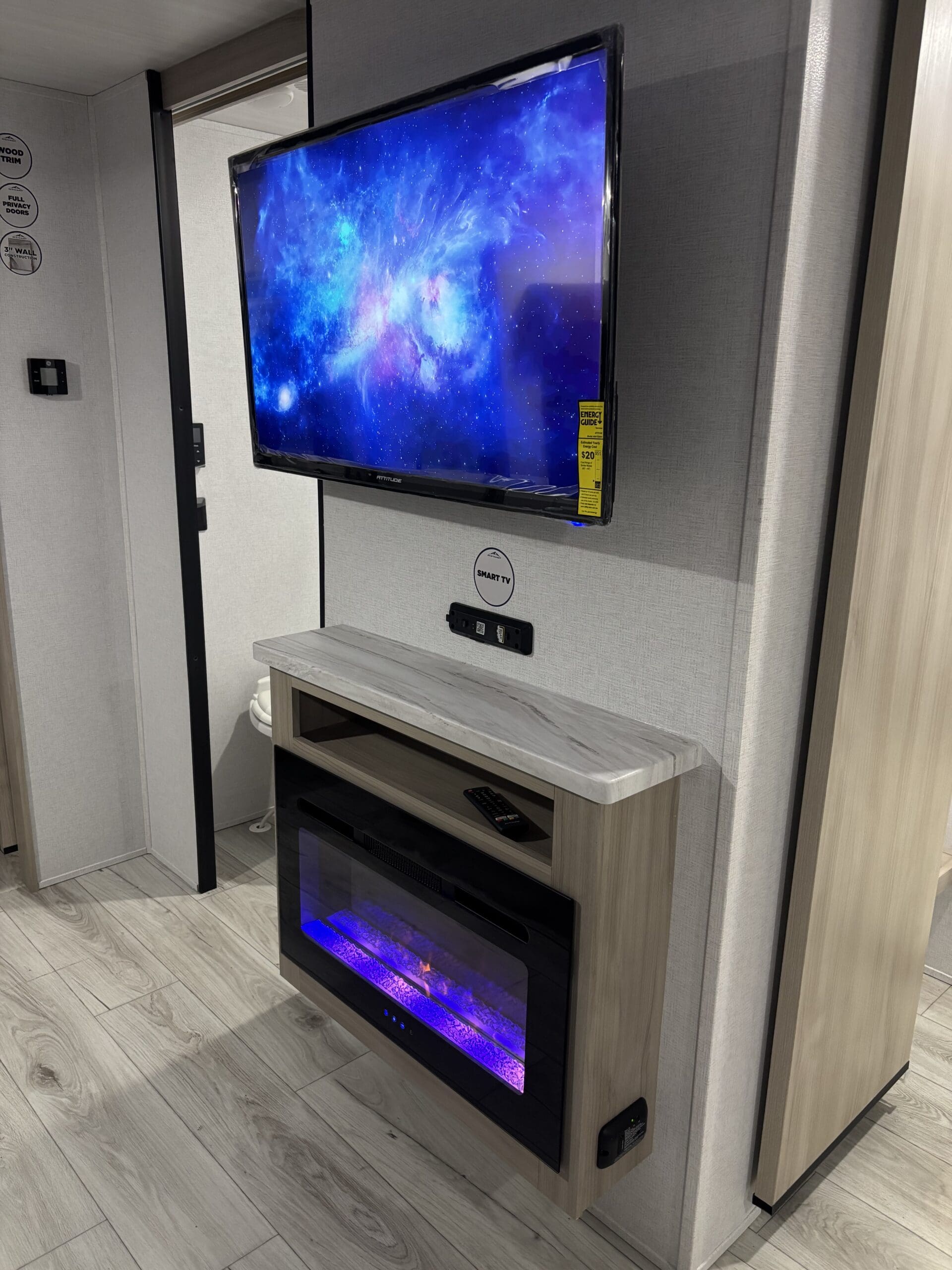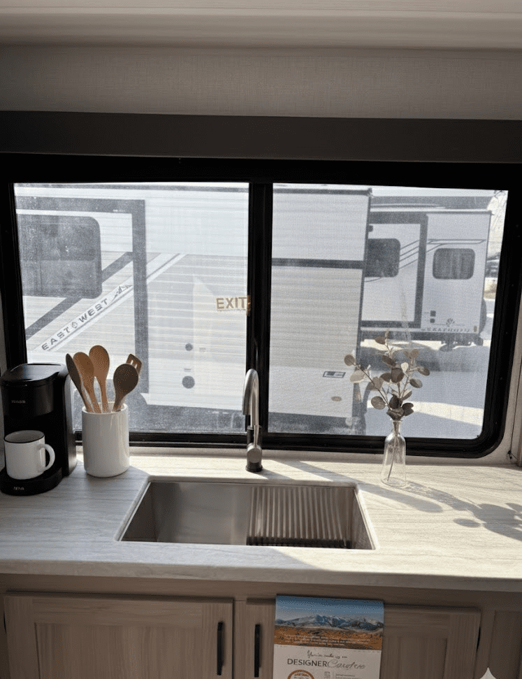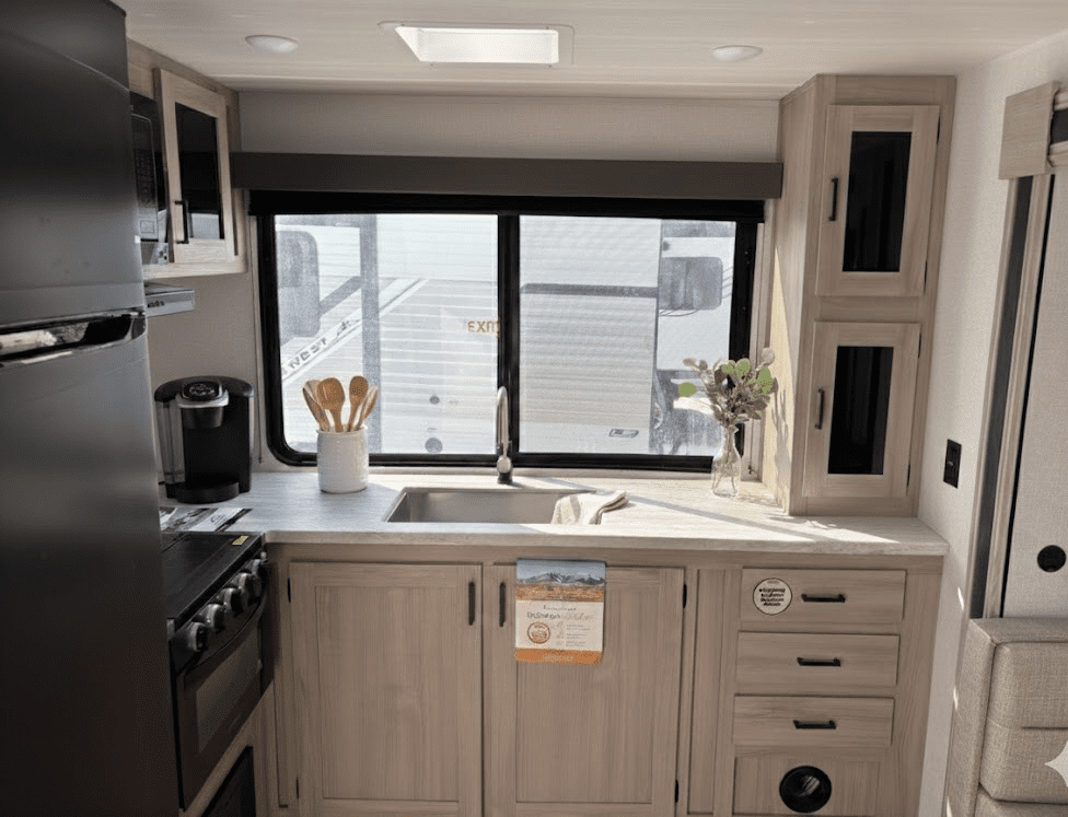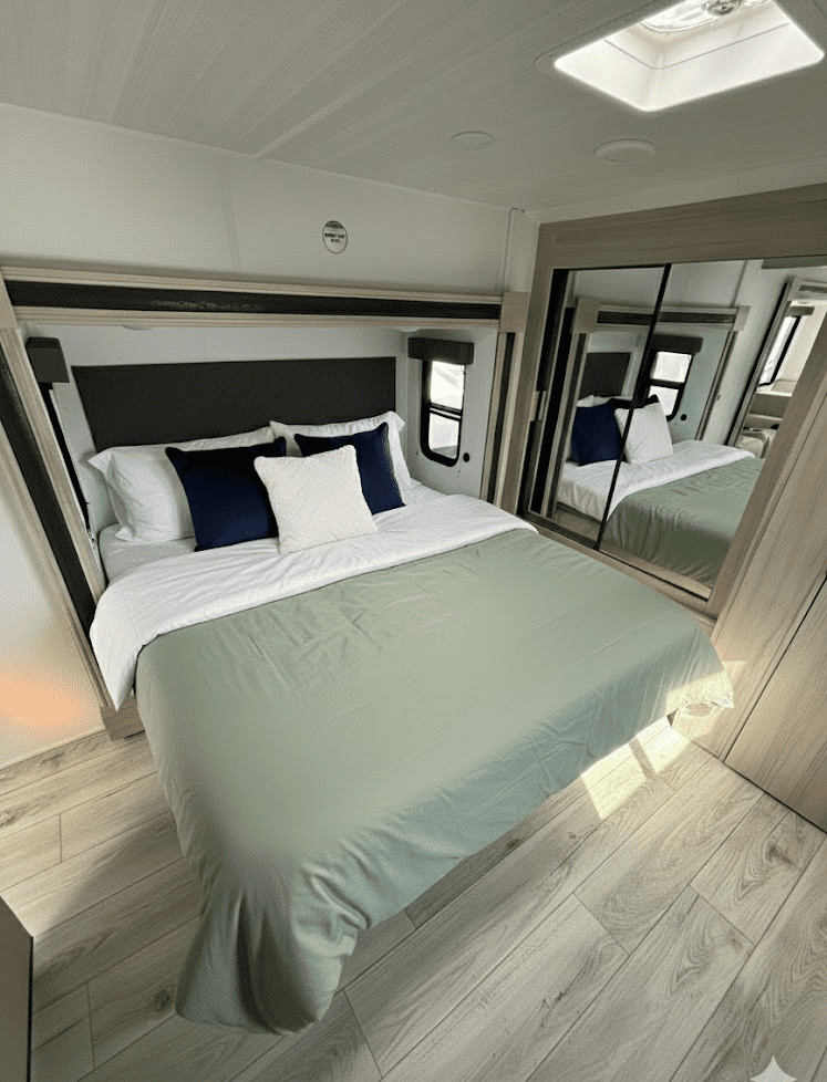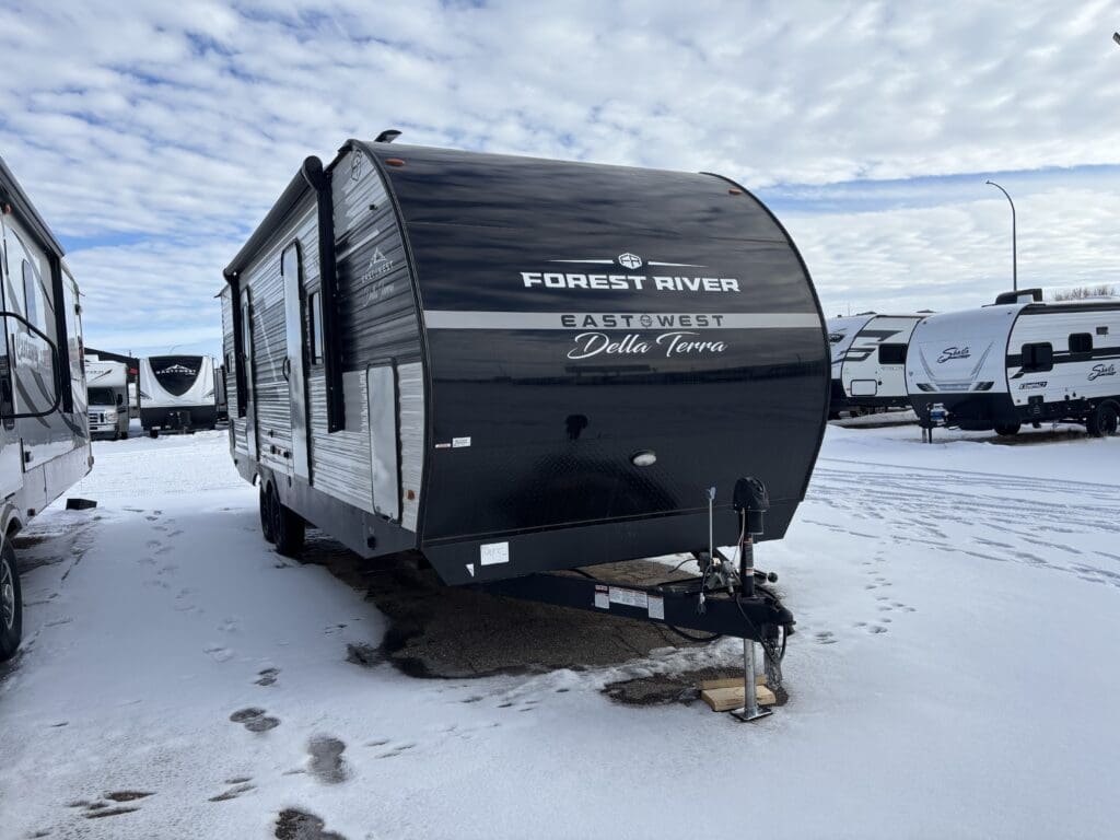 Della Terra Trailer DET263RK- This two slide travel trailer is sure to impress! With this floor plan, say goodbye to having to choose between having a bigger bedroom or a bigger entertainment/kitchen area, this floor plan provides both! Walking in at the rear door, you’ll have a closet right when you walk in to keep your doorway mess free. To the left, you’ll have a beautiful rear kitchen to satisfy all your cooking desires, along with a dinette to enjoy those freshly prepared meals on. The seating beside sits right in front of the fireplace and TV, perfect for relaxing after a long day at the beach. Thanks to an additional slide in the bedroom, the bedroom has an ample amount of space. The bedroom also features a separate entry door, oversized closet, and washer/dryer prep.