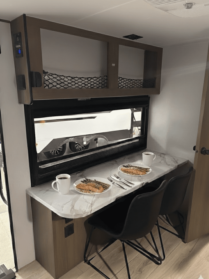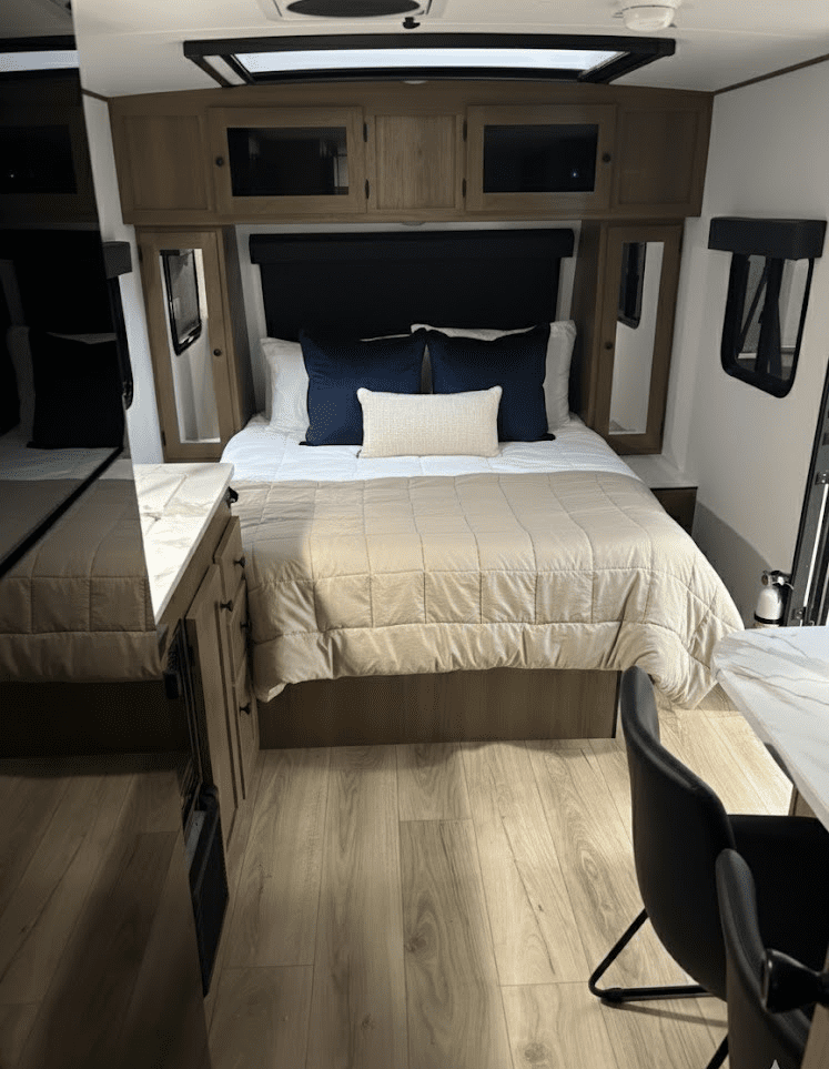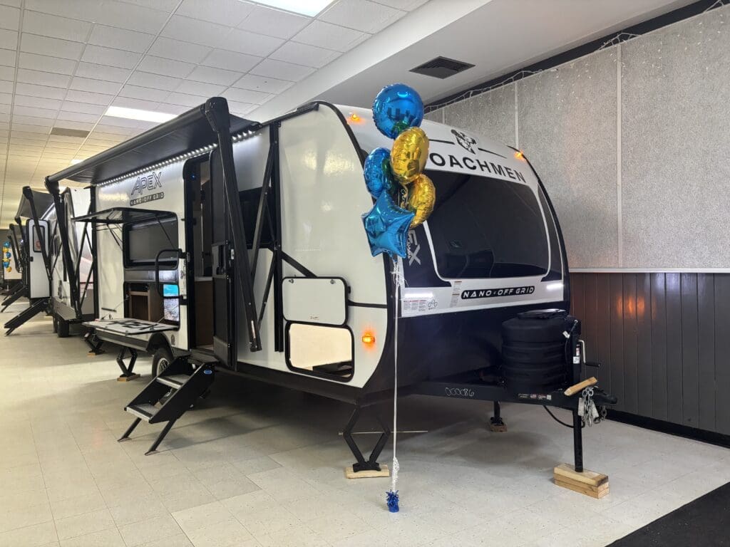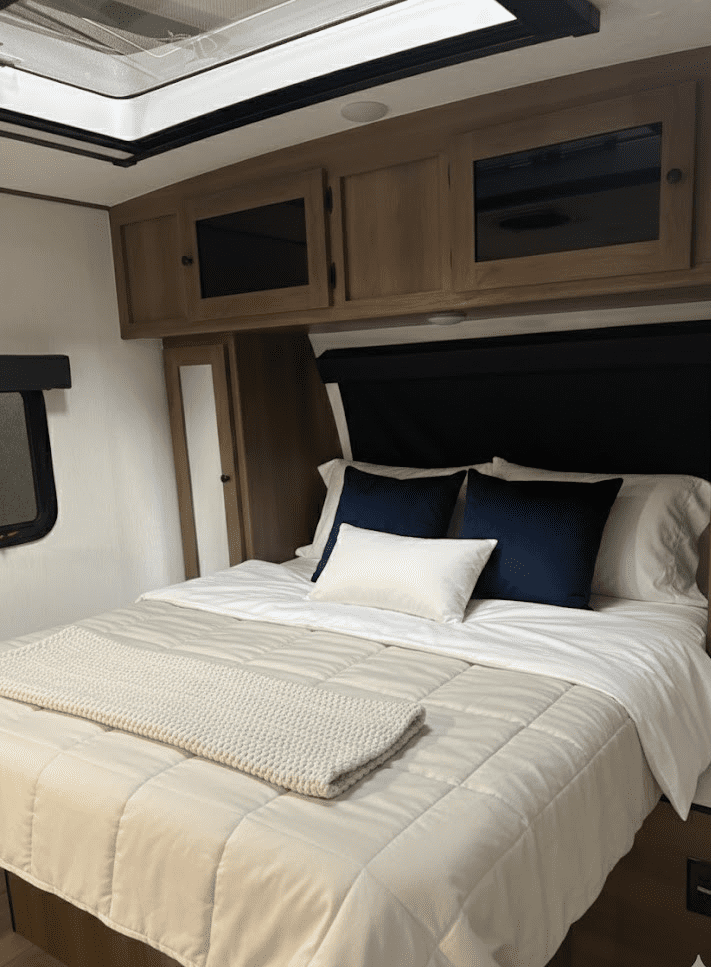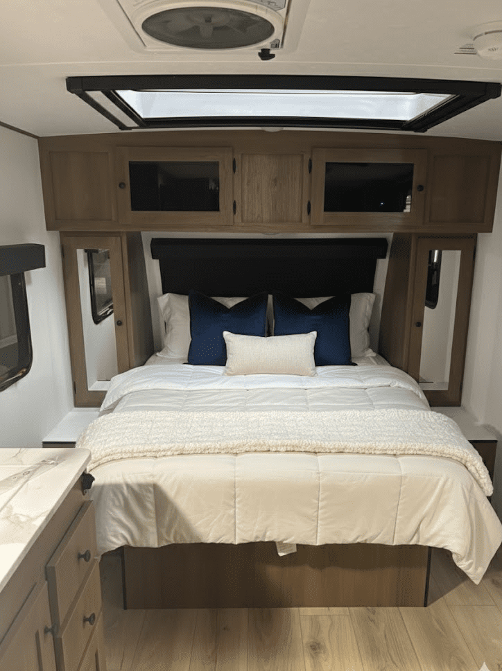 At just 21′ 5″ and under 3,500 lb. dry, the Apex Nano 181RB is a minimalist adventurer’s dream. It is light enough for SUVs or half-ton trucks, yet delivers 52 gallons of fresh water, a rear bath, indoor-outdoor bar top design, perfect for couples chasing big views and weekend escapes.