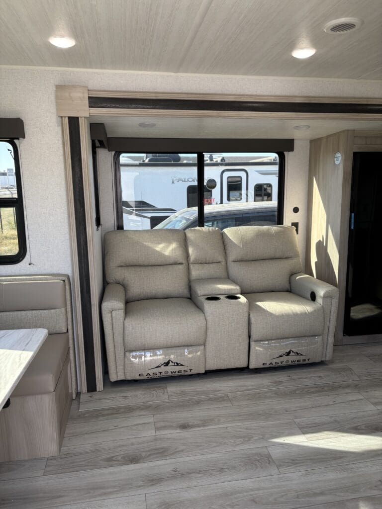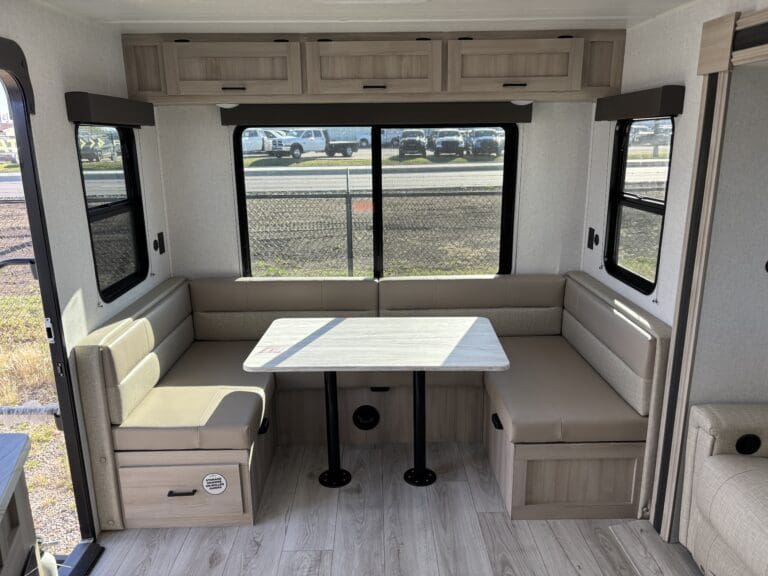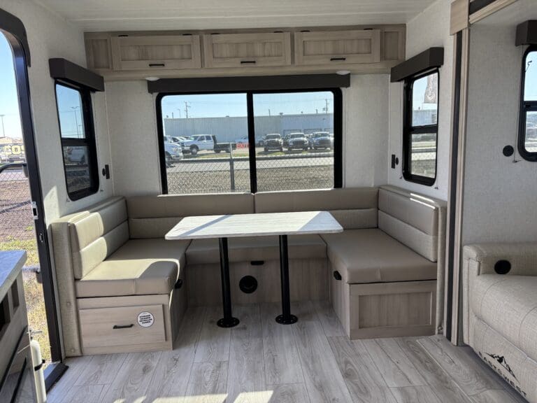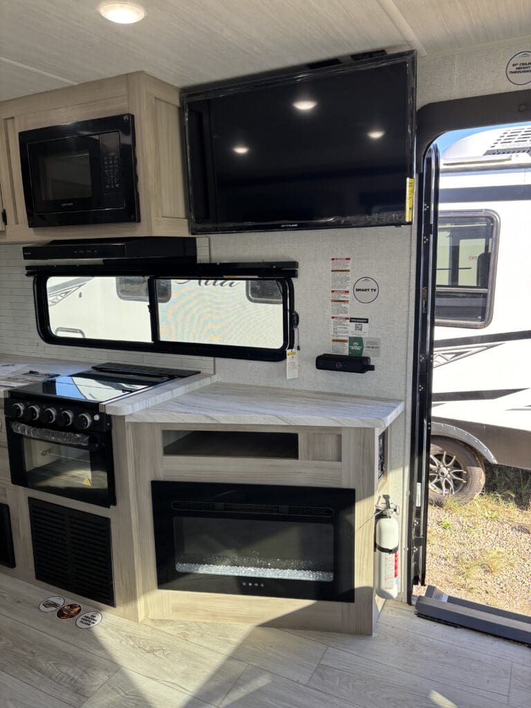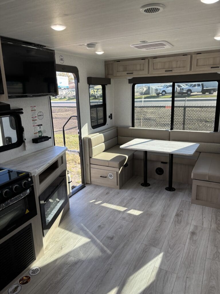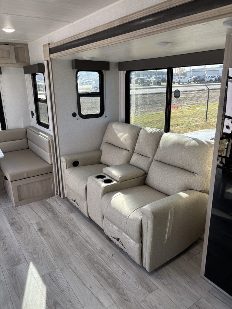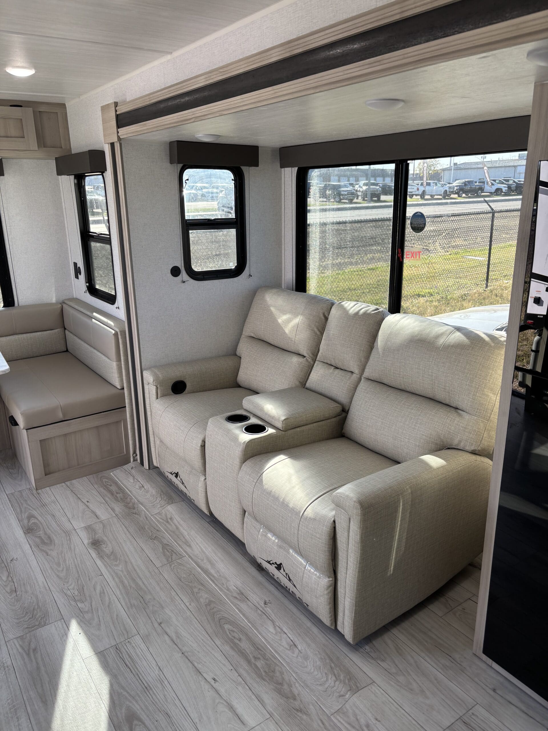 Welcome to the perfect couples floorplan! This camper is under 30ft total length but you don’t have to sacrifice having any of the luxuries. The oversized u-shaped dinette in the rear of the trailer is surrounded with windows and is perfect for dinners or game nights! Ready to relax after a fun-filled day? Sink into the comfortable reclining theatre seats that puts you in perfect view of the TV and fireplace. Other notable features include a gorgeous but functional kitchen, a walkthrough bathroom, and a private front bedroom with a separate entry/exit door. Enjoy highly desirable features like powered stabilizer jacks, front power jack, 200w solar, a tankless water heater, a 12V fridge, and so much more!