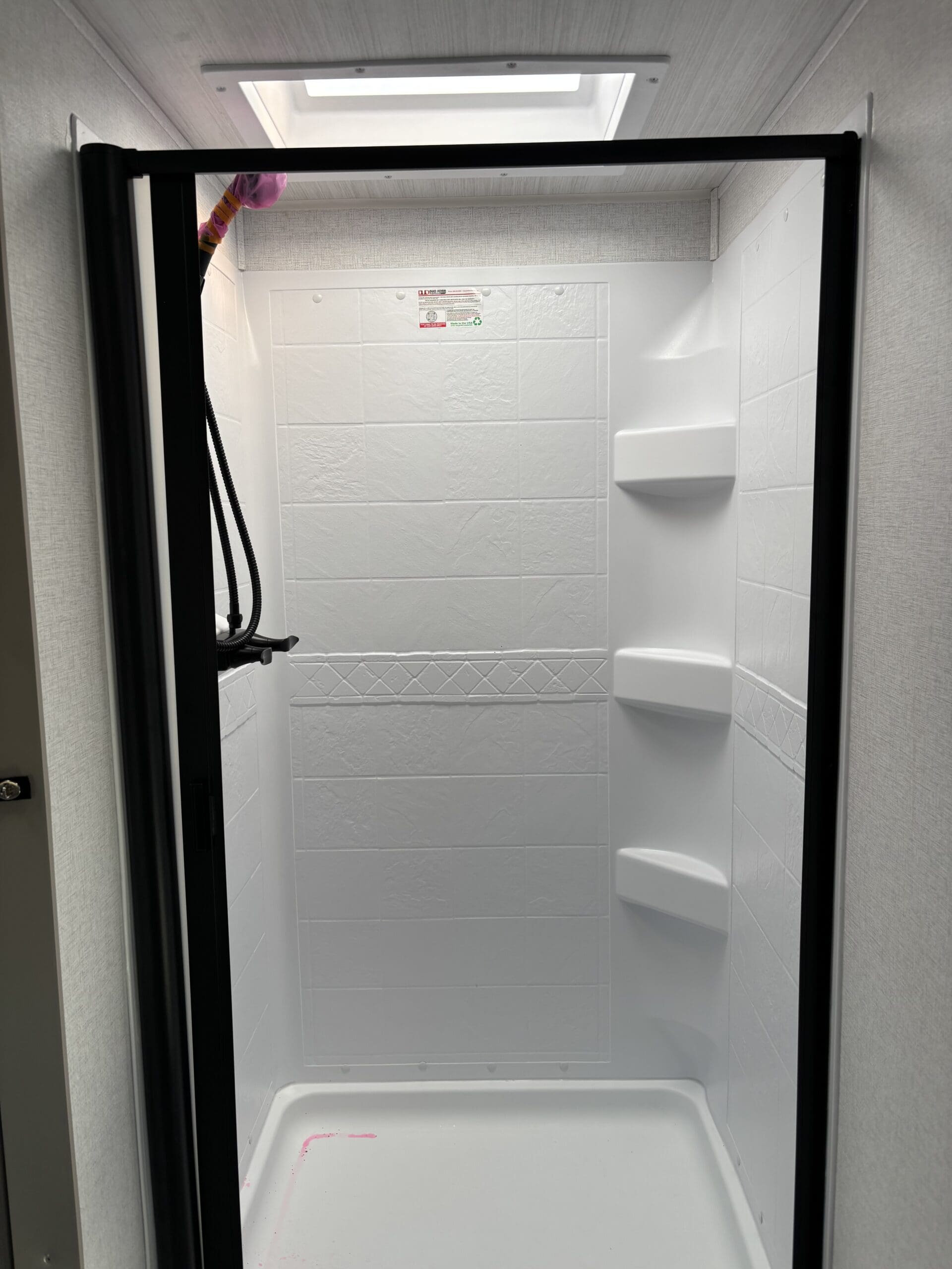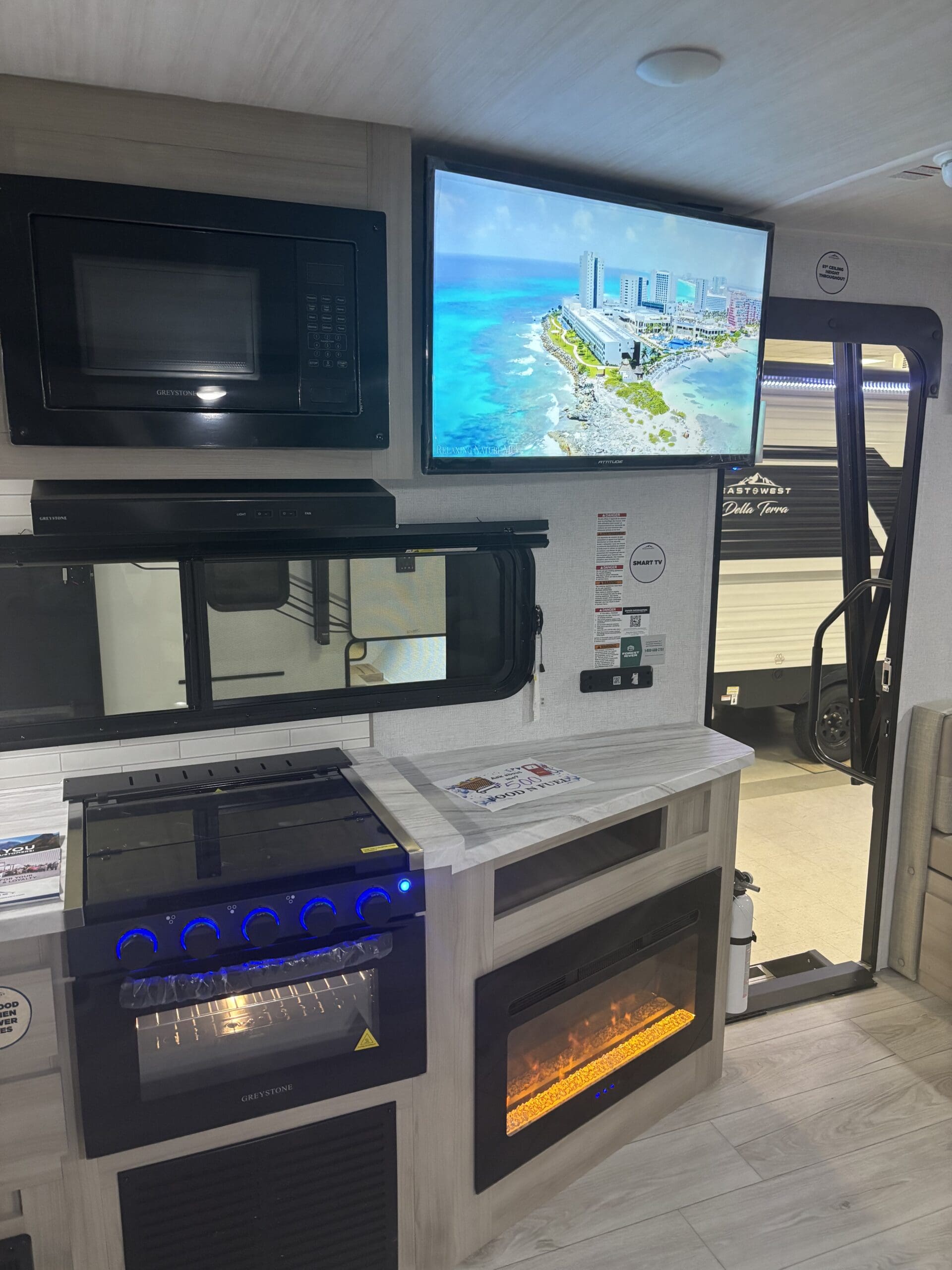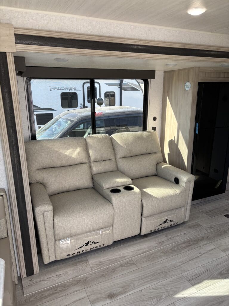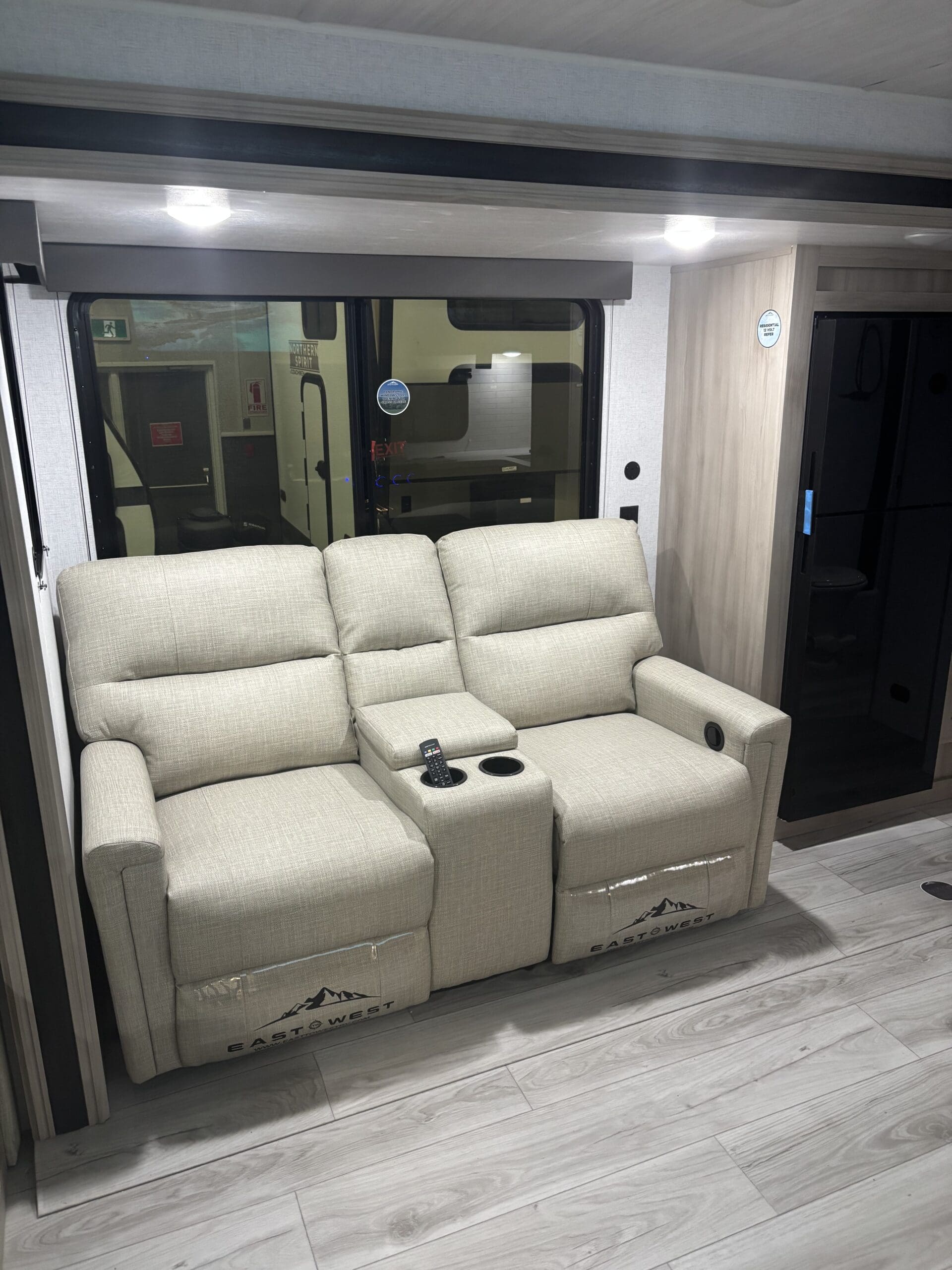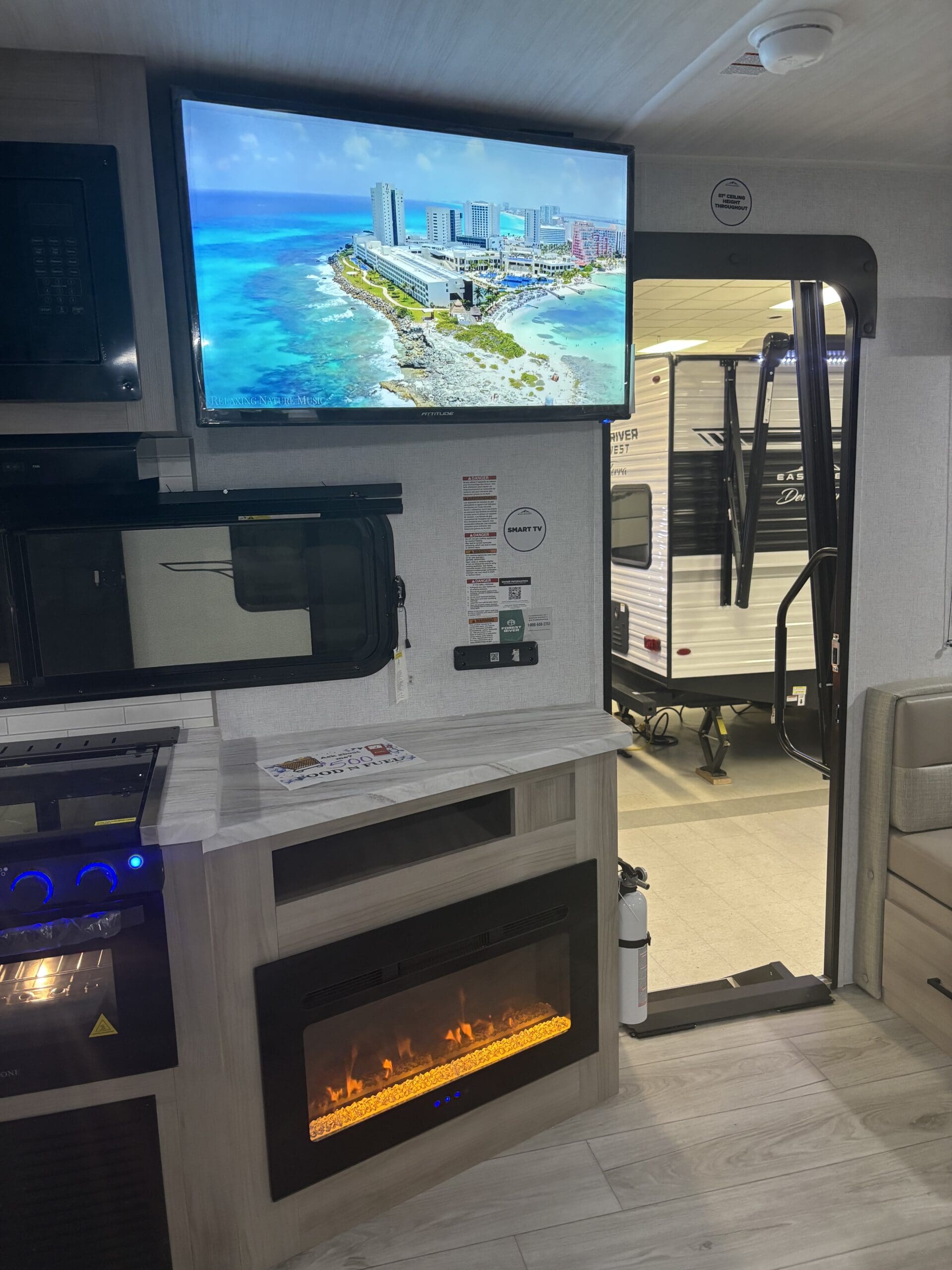 Welcome to the perfect couples floorplan! This camper is under 30ft total length but you don’t have to sacrifice having any of the luxuries. The oversized u-shaped dinette in the rear of the trailer is surrounded with windows and is perfect for dinners or game nights! Ready to relax after a fun-filled day? Sink into the comfortable reclining theatre seats that puts you in perfect view of the TV and fireplace. Other notable features include a gorgeous but functional kitchen, a walkthrough bathroom, and a private front bedroom with a separate entry/exit door. Enjoy highly desirable features like powered stabilizer jacks, front power jack, 200w solar, a tankless water heater, a 12V fridge, and so much more!