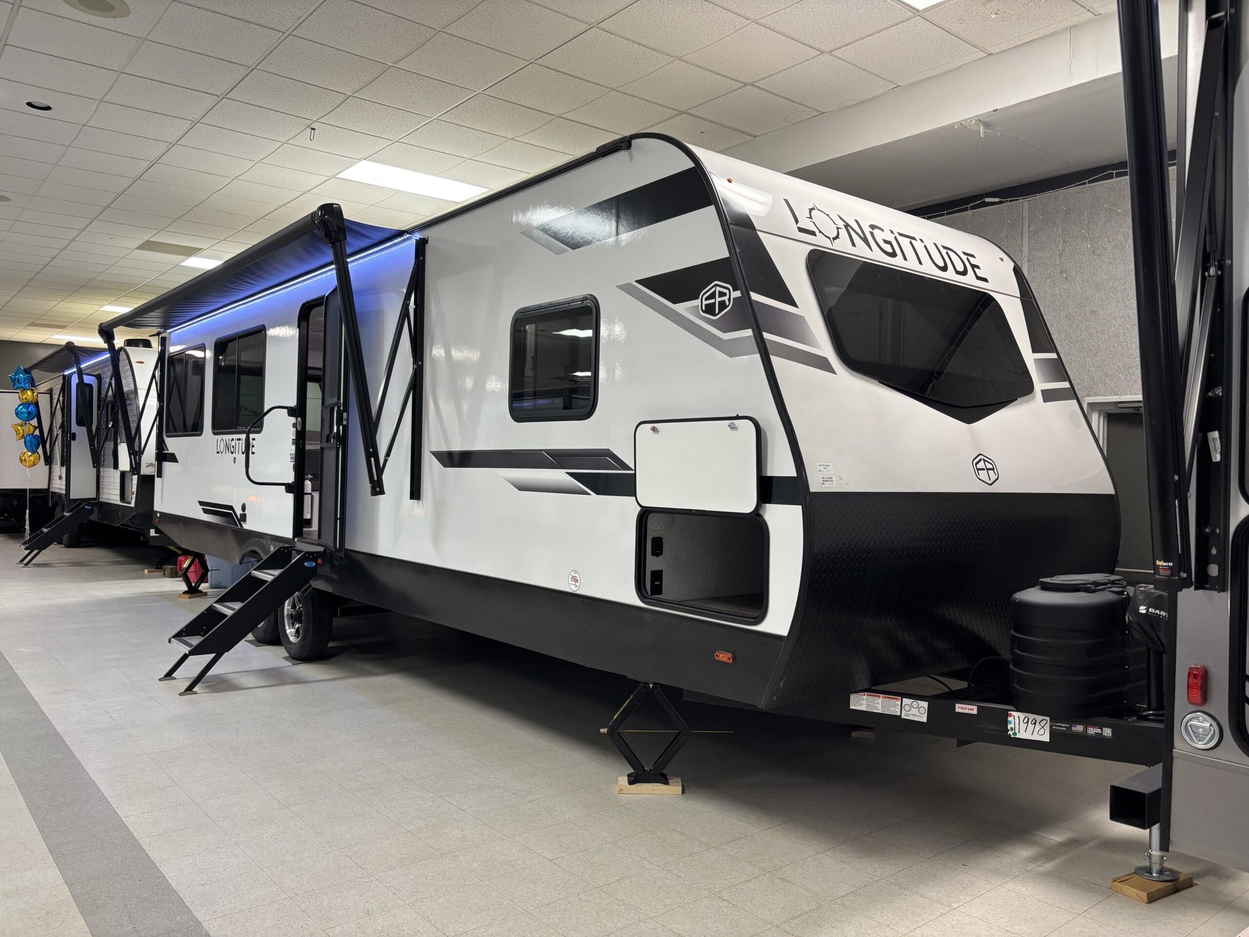 Welcome to your new home away from home! This isn’t just a weekend getaway, you’ll be more than happy and comfortable staying in this camper all summer long! Spend some time outdoors under the 21ft awning or take the fun inside, whether its cooking up a storm in the beautiful yet practical kitchen, or just enjoying some downtime by the fireplace on the relaxing L-shaped sofa. Never run short on natural light either, the abundance of windows in the living area completes the trailer. The L-shaped sofa isn’t the only comfortable seating, the kitchen features a dinette that is half bench seating and the other half has two chairs. The front private bedroom has a queen mattress, a nightstand on both sides of the bed, and a wardrobe on the bedroom slide. Also on the bedroom slide is a linen closet in the bathroom.