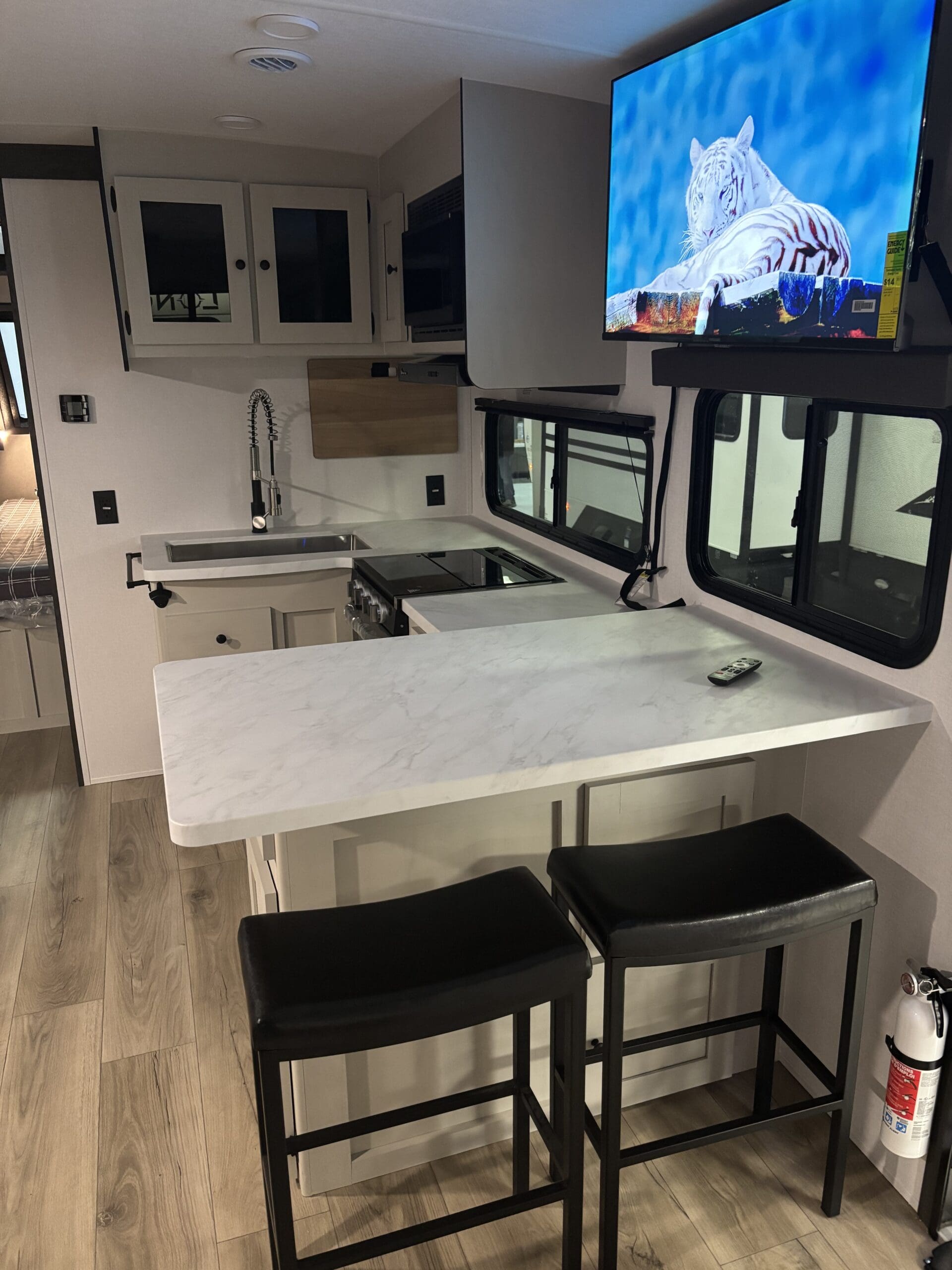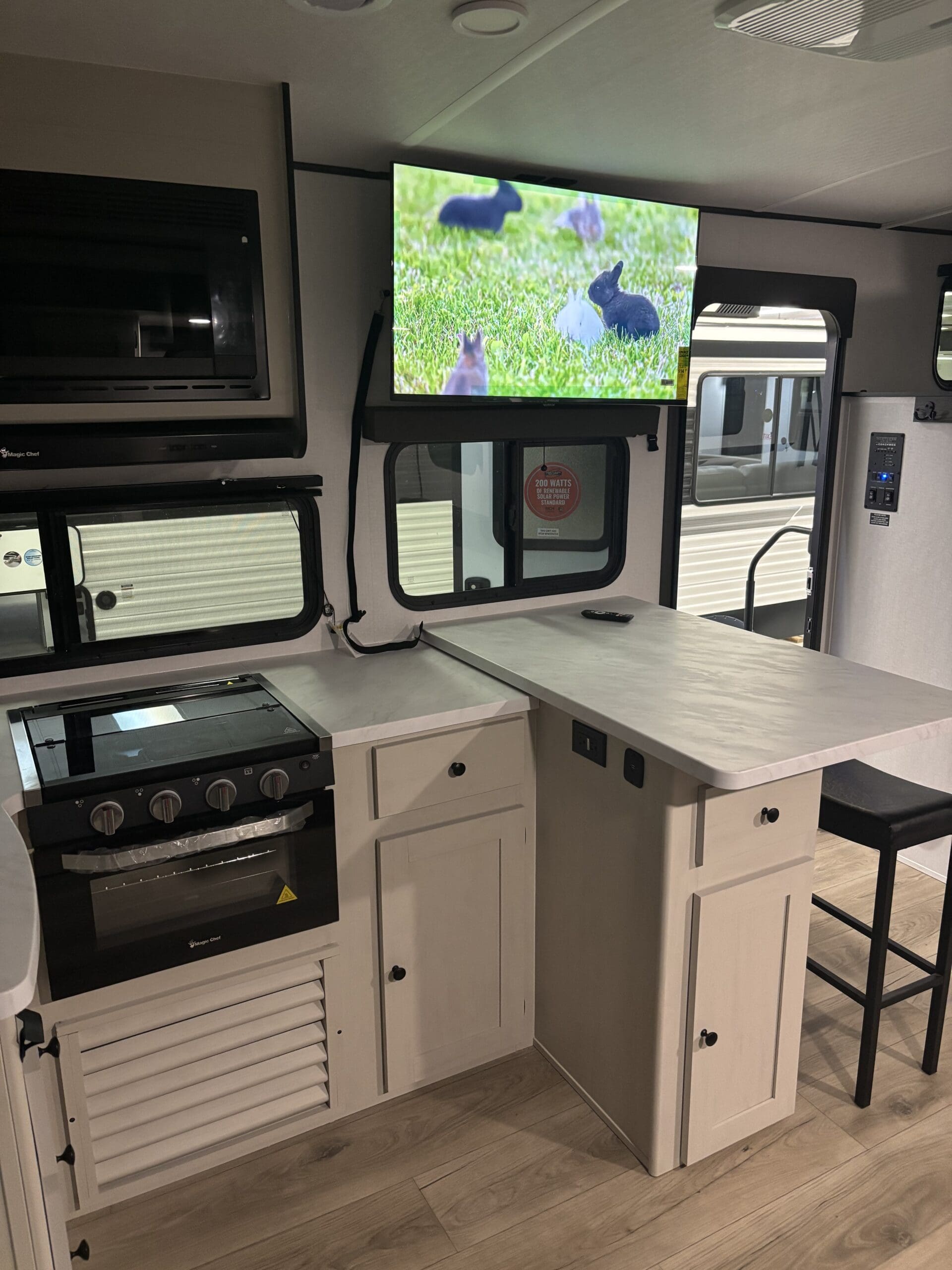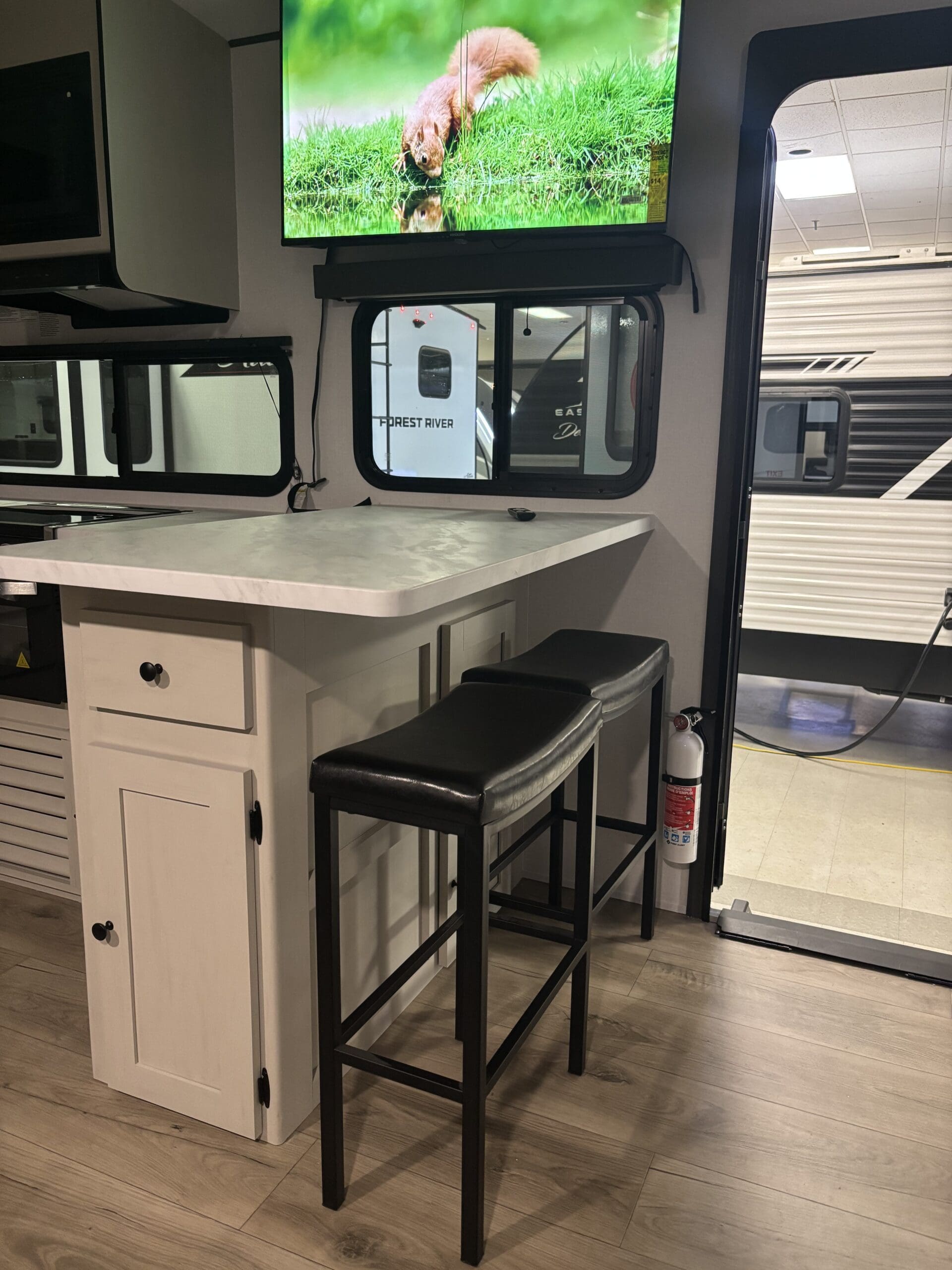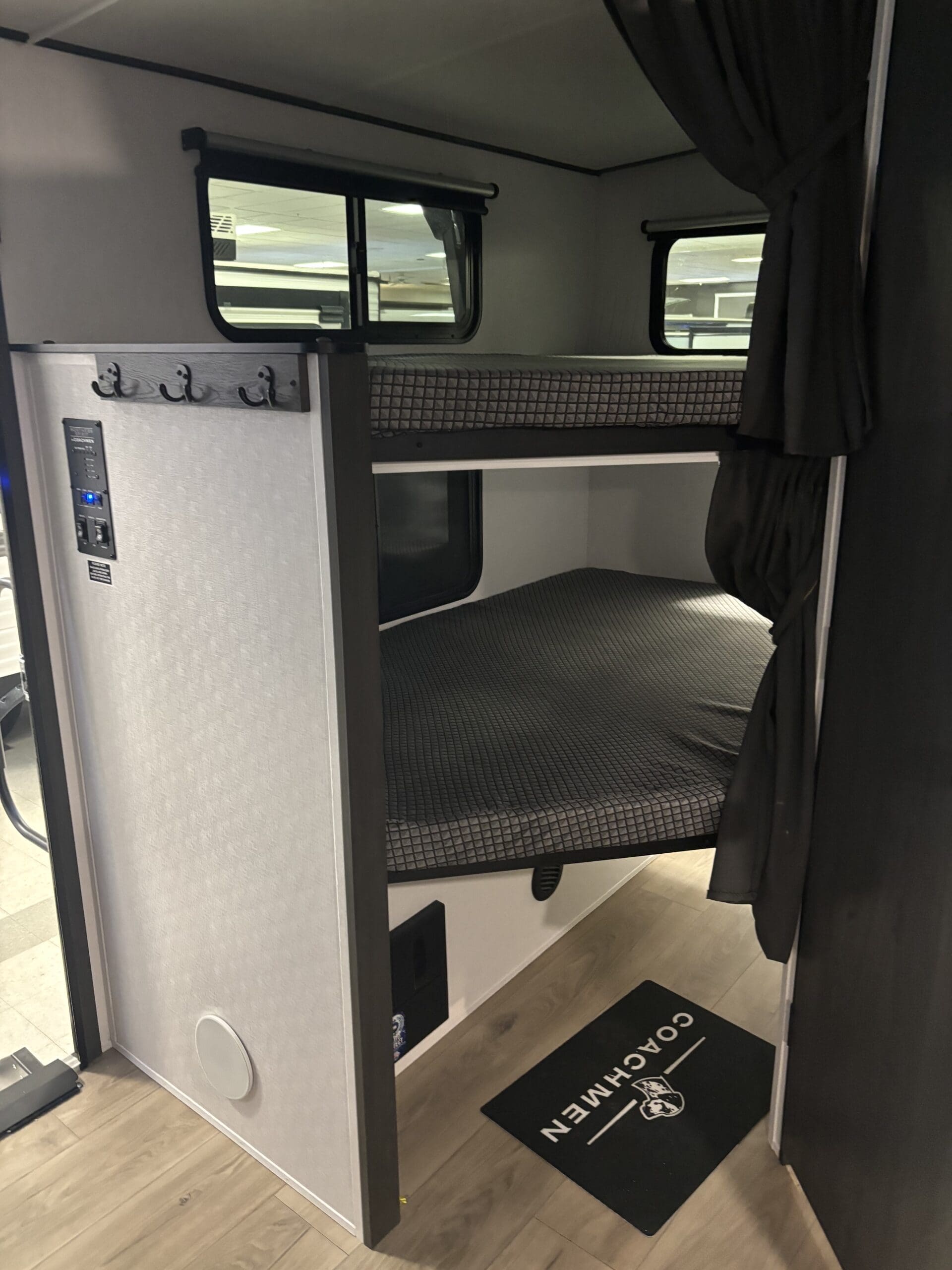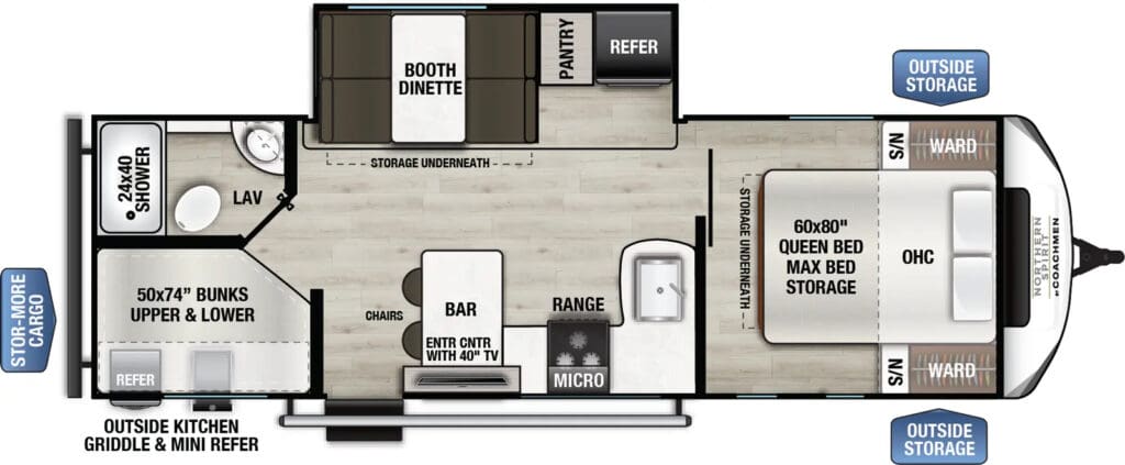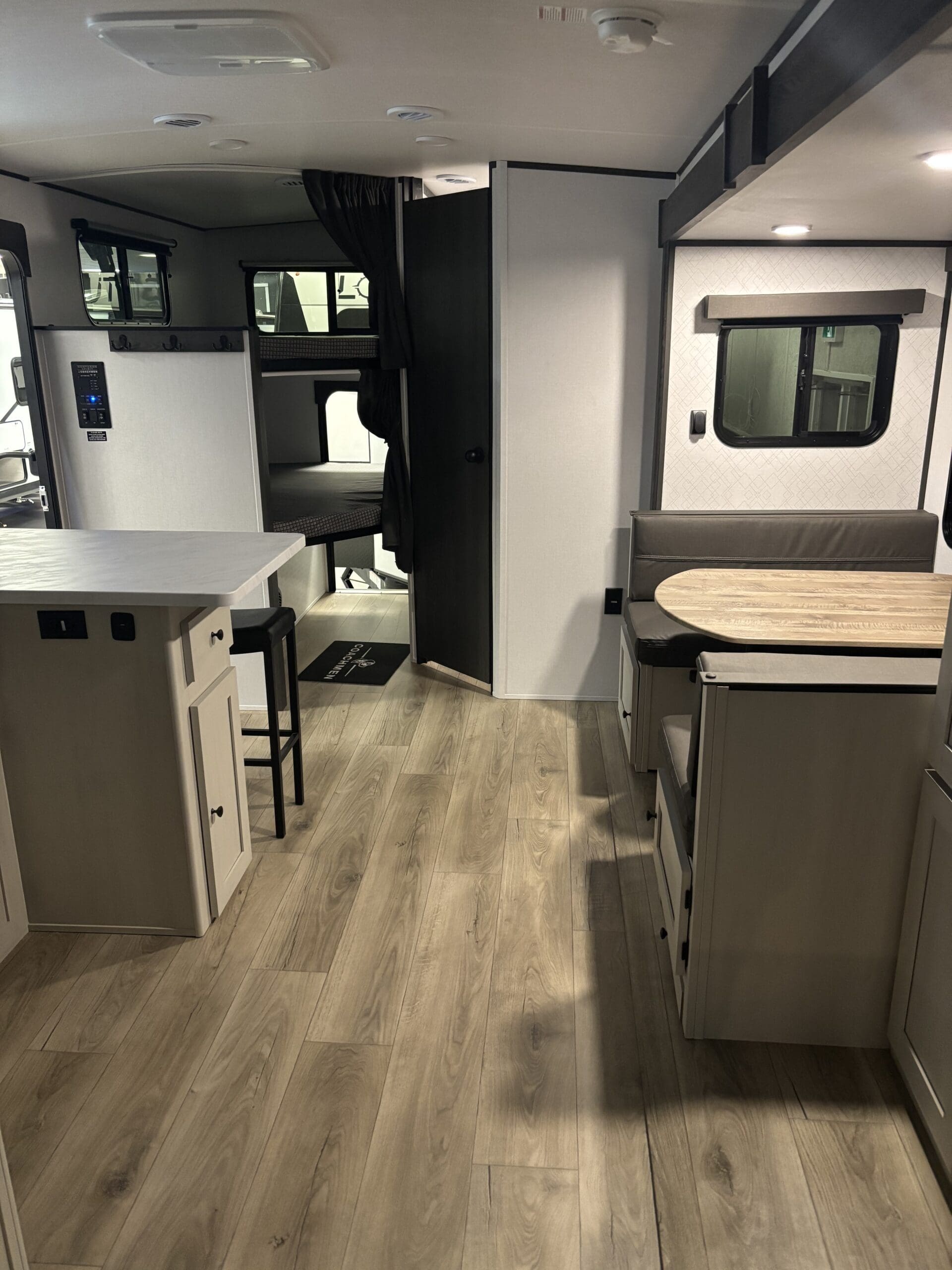 This midsize bunk floorplan is perfect for the family. Coming in under 30 feet overall and just under 6000 lb., the 2457BH features a booth dinette, a breakfast bar with chairs, huge pantry, an abundance of counterspace, double over double bunks, and an outside kitchen. The bottom bunk lifts up to make use of our “Store More” cargo center, which is perfect for bikes, coolers, kayaks, totes, or any other storage items.