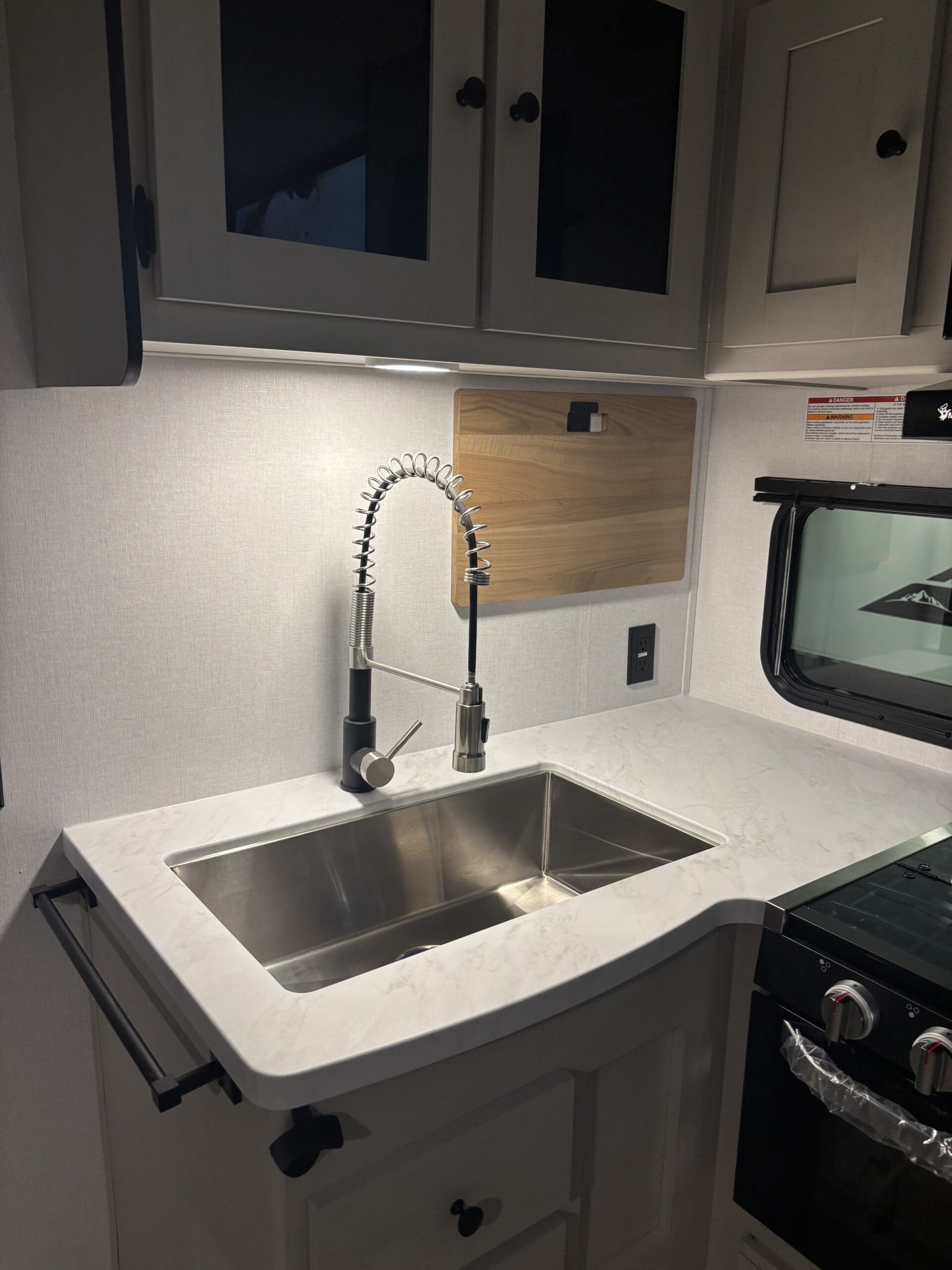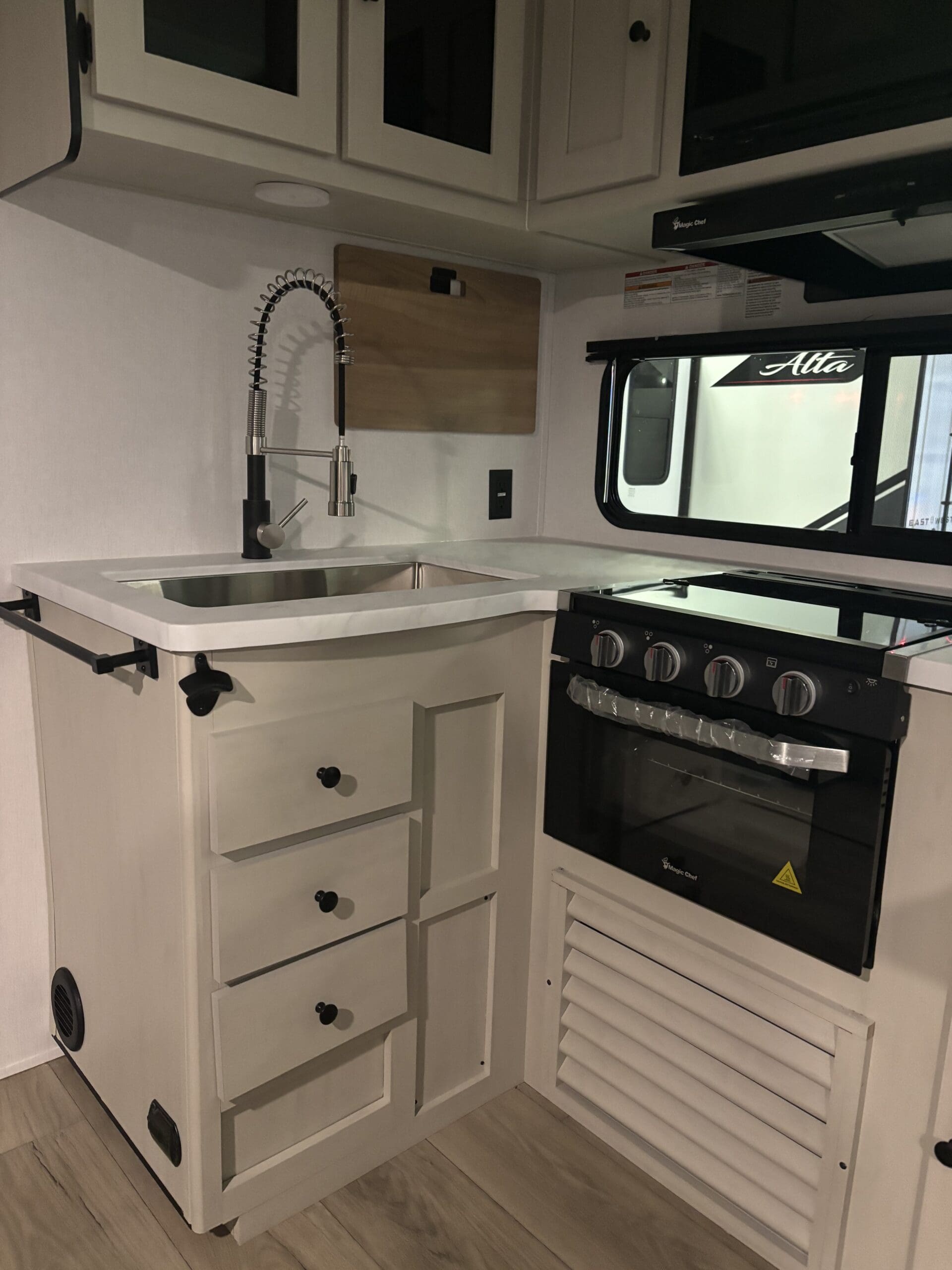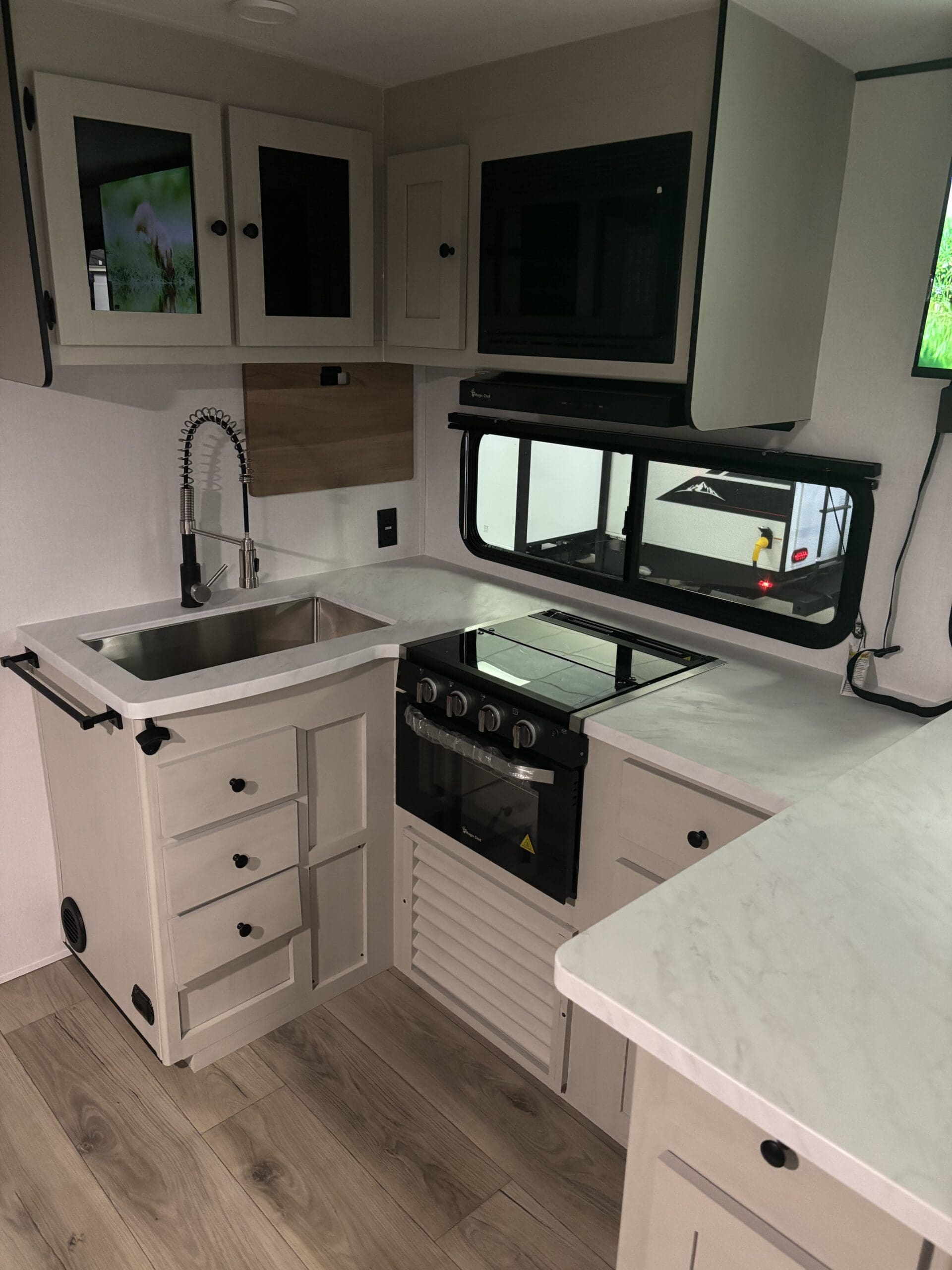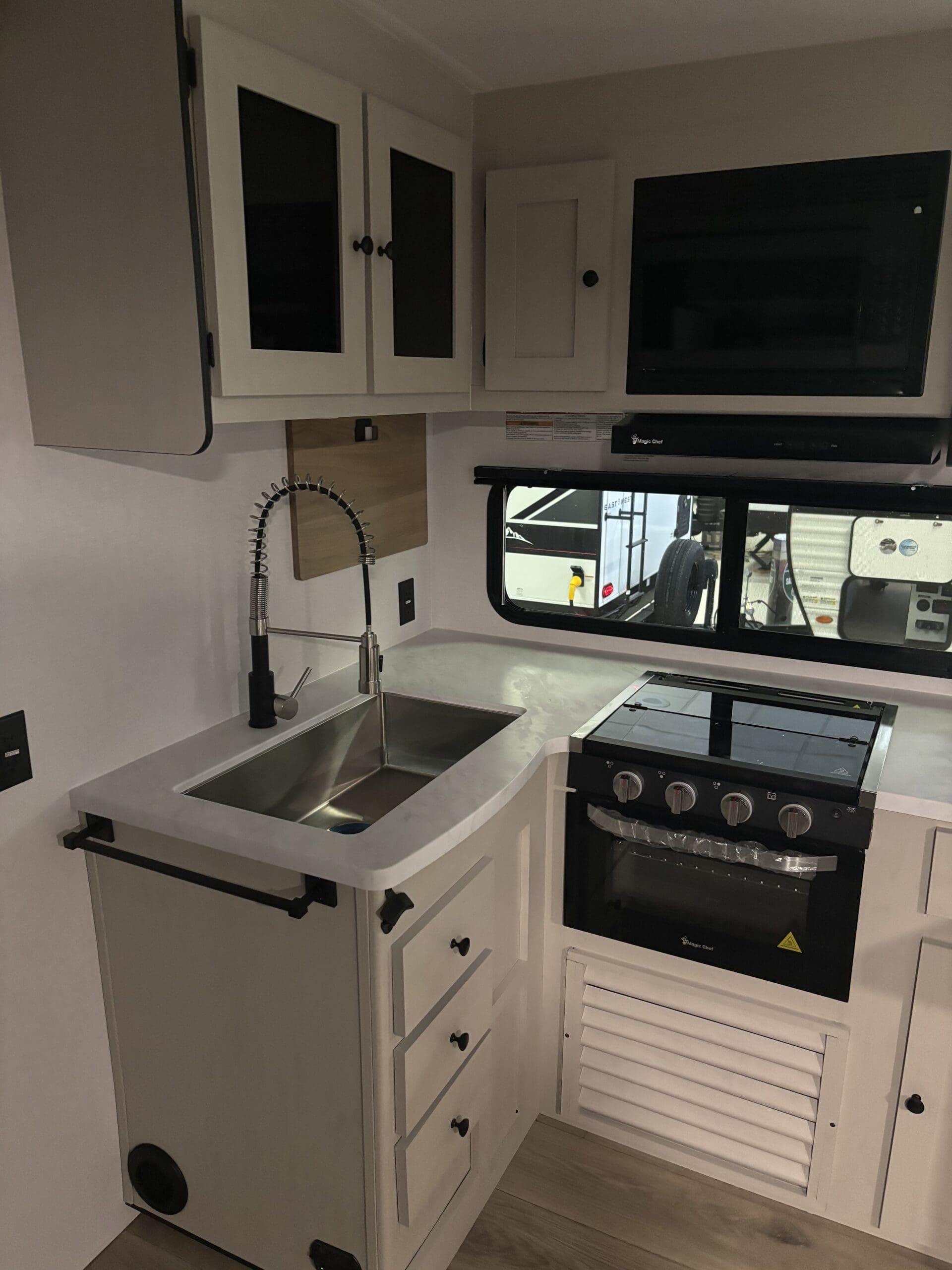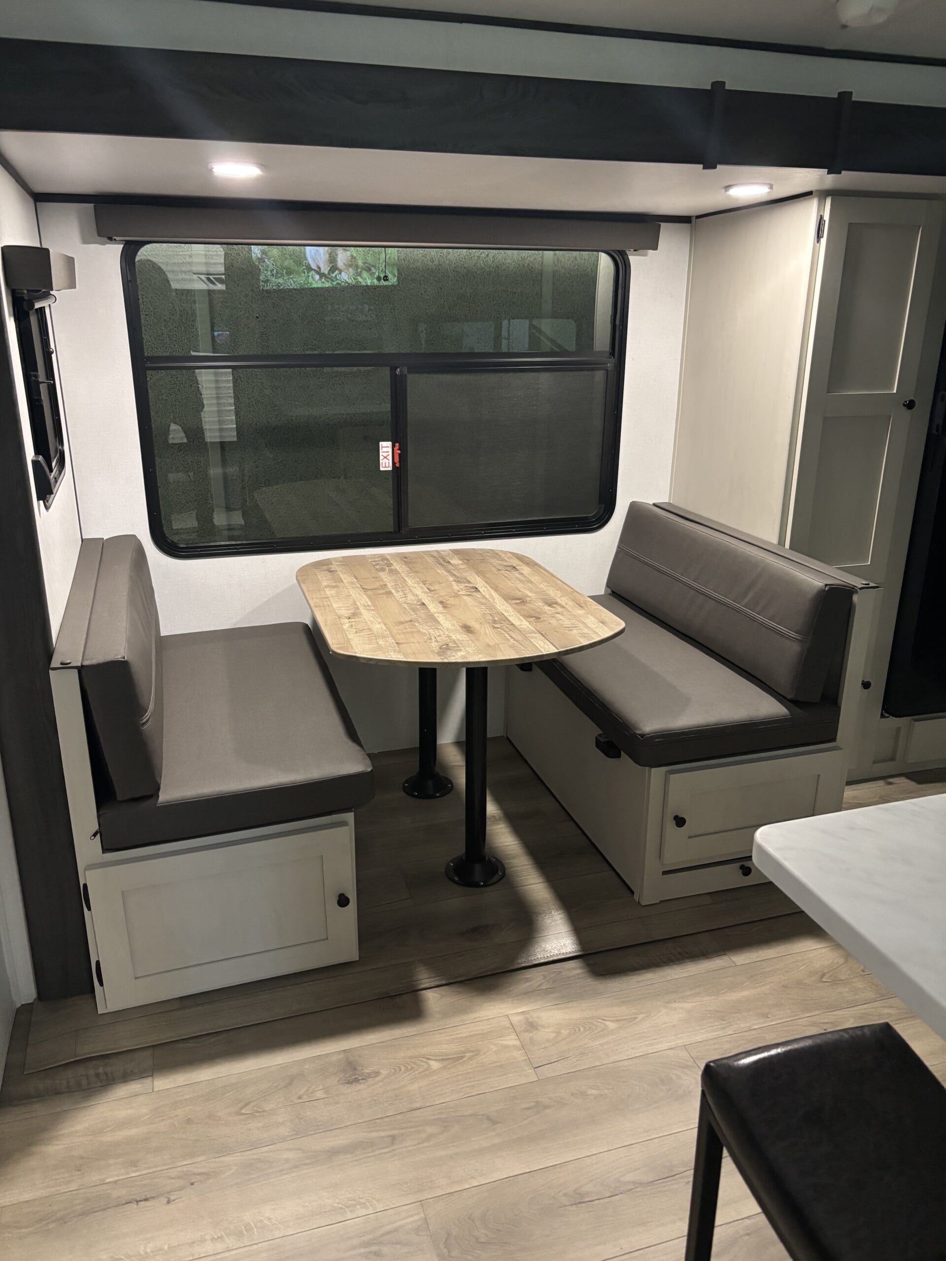 This midsize bunk floorplan is perfect for the family. Coming in under 30 feet overall and just under 6000 lb., the 2457BH features a booth dinette, a breakfast bar with chairs, huge pantry, an abundance of counterspace, double over double bunks, and an outside kitchen. The bottom bunk lifts up to make use of our “Store More” cargo center, which is perfect for bikes, coolers, kayaks, totes, or any other storage items.