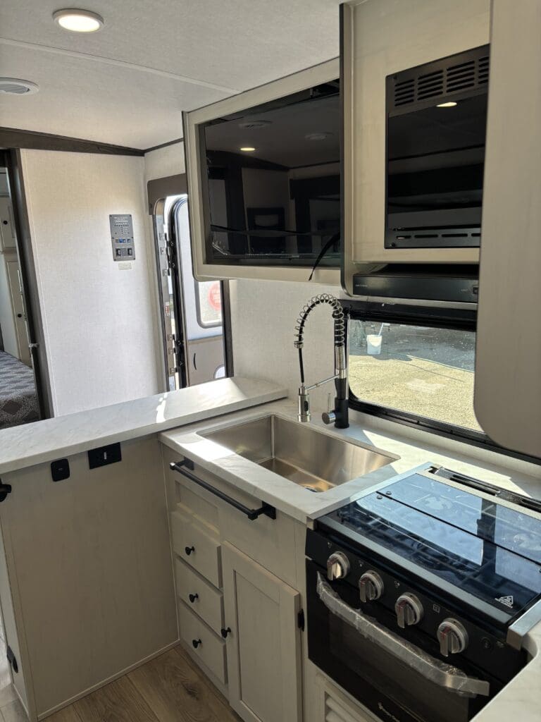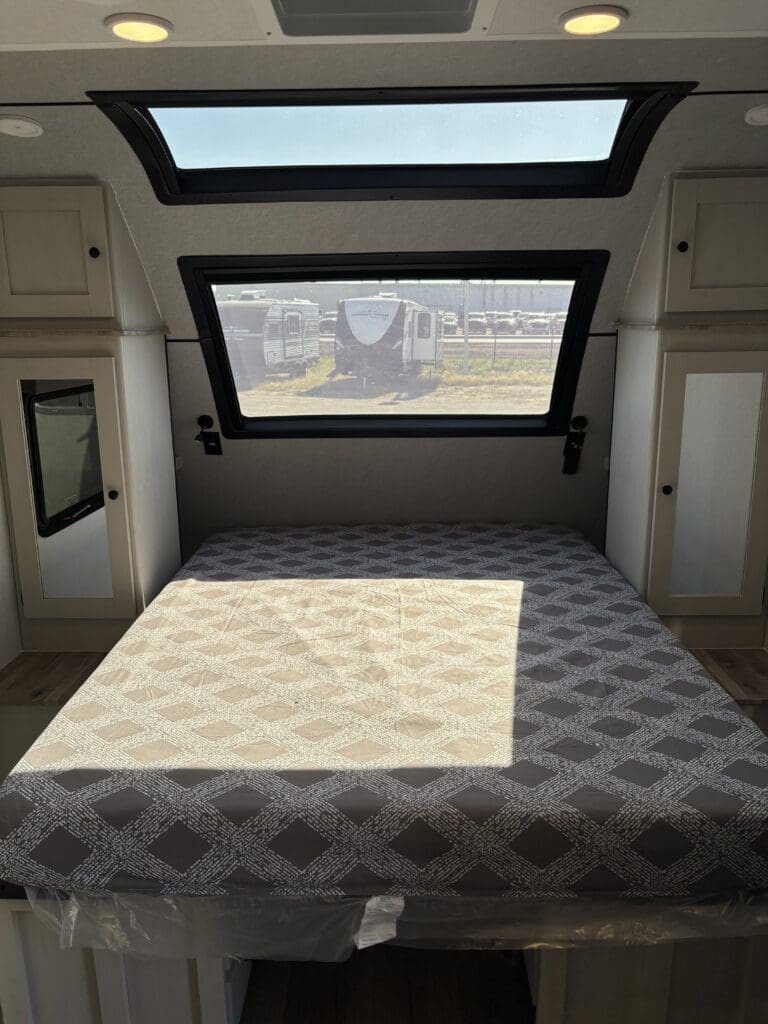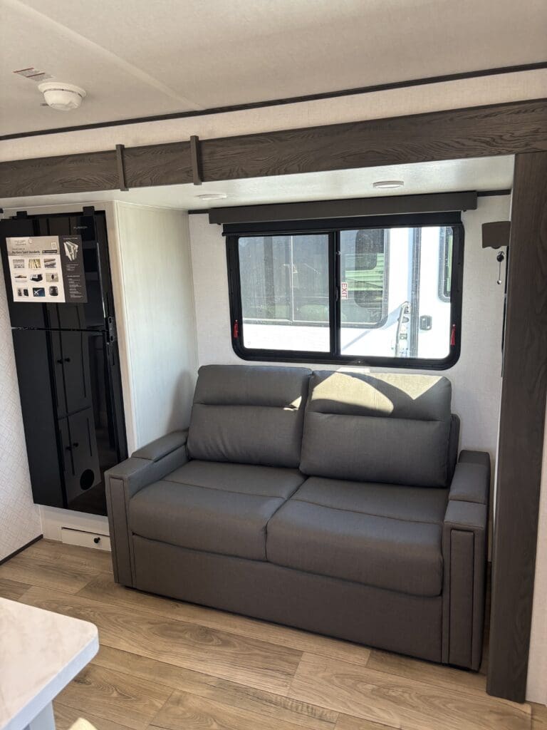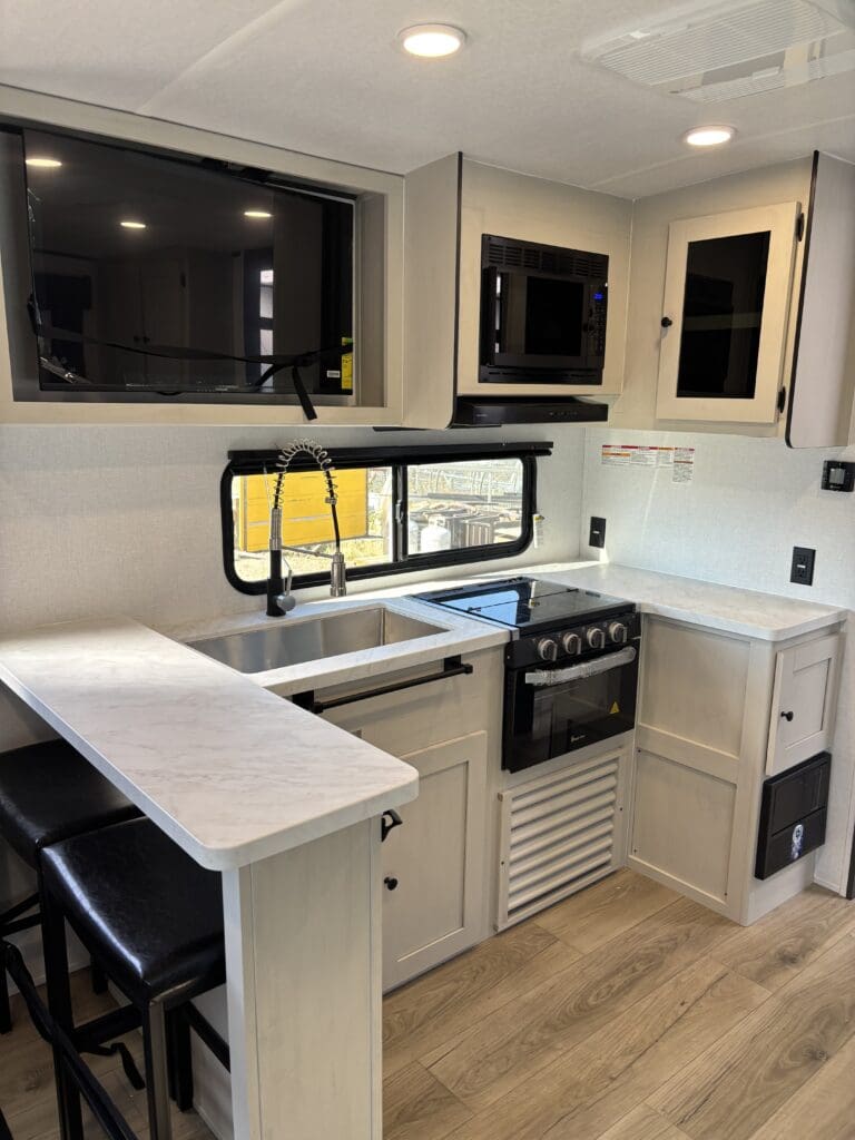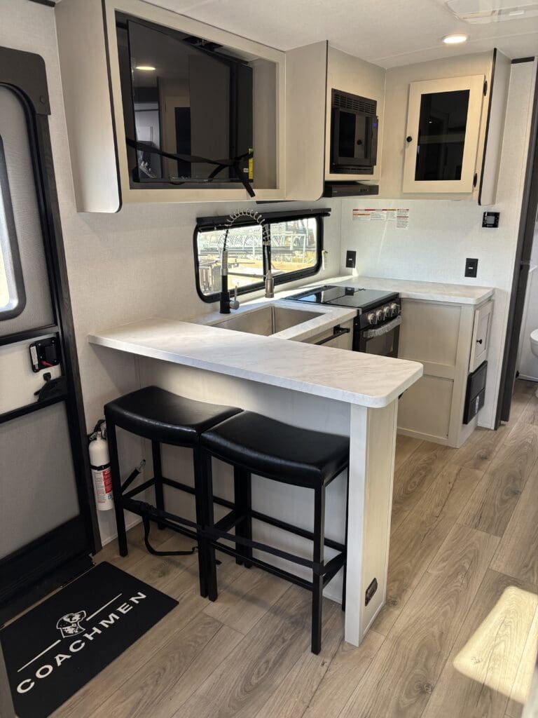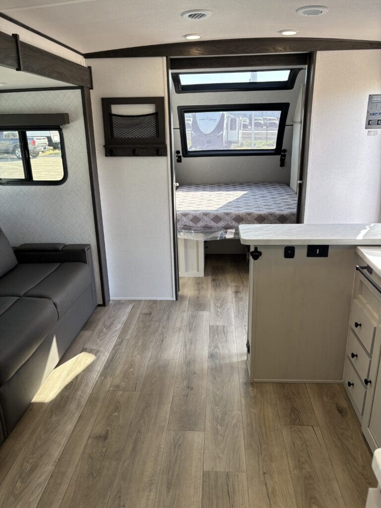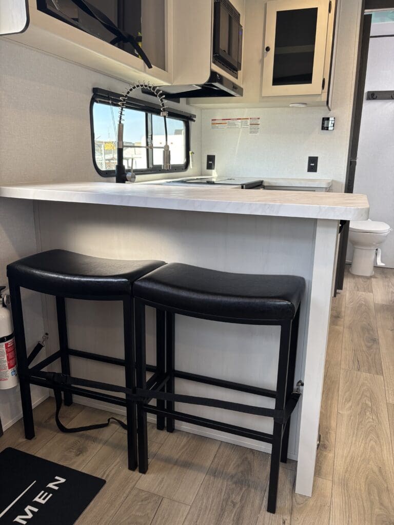 This wide open floorplan includes a deep slide with Theater Seats and Direct View Entertainment, as well as a large L-shaped bar top with residential style chairs. The 2353 feels huge with the bedroom doors opening up to the all new “Skyview” Front Cap.