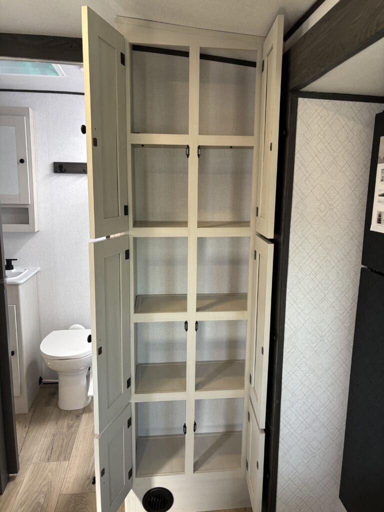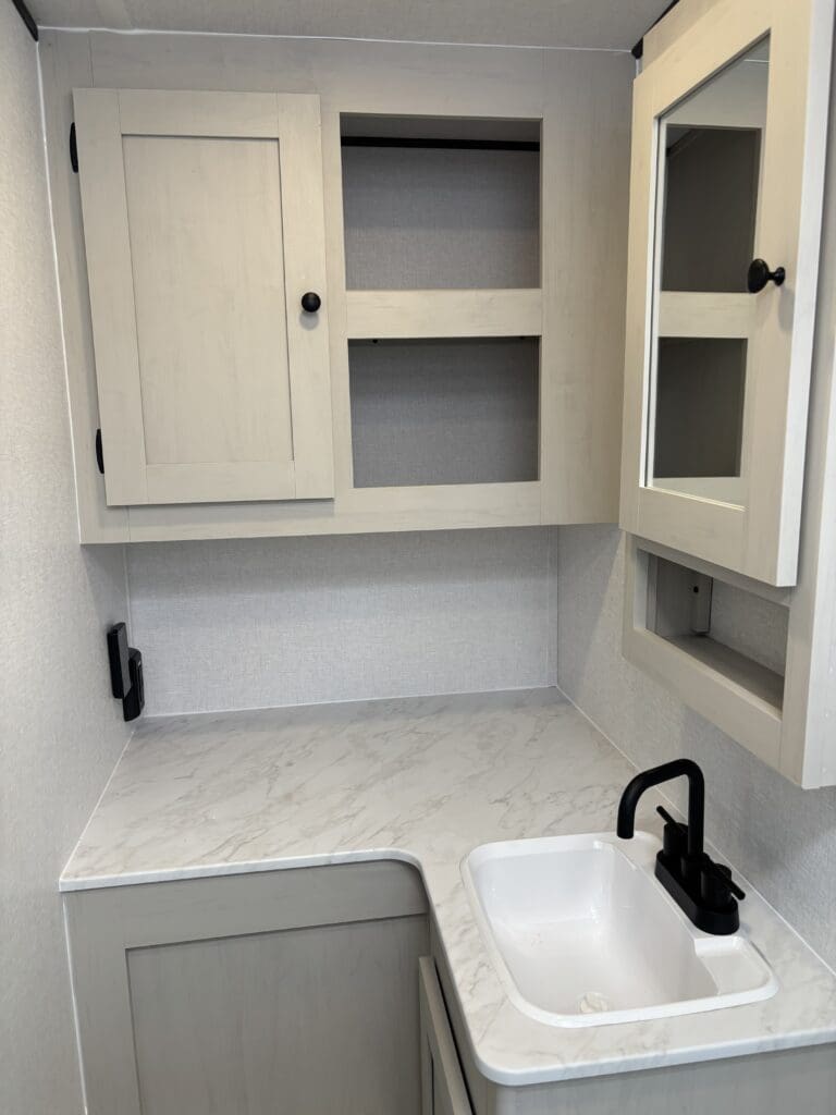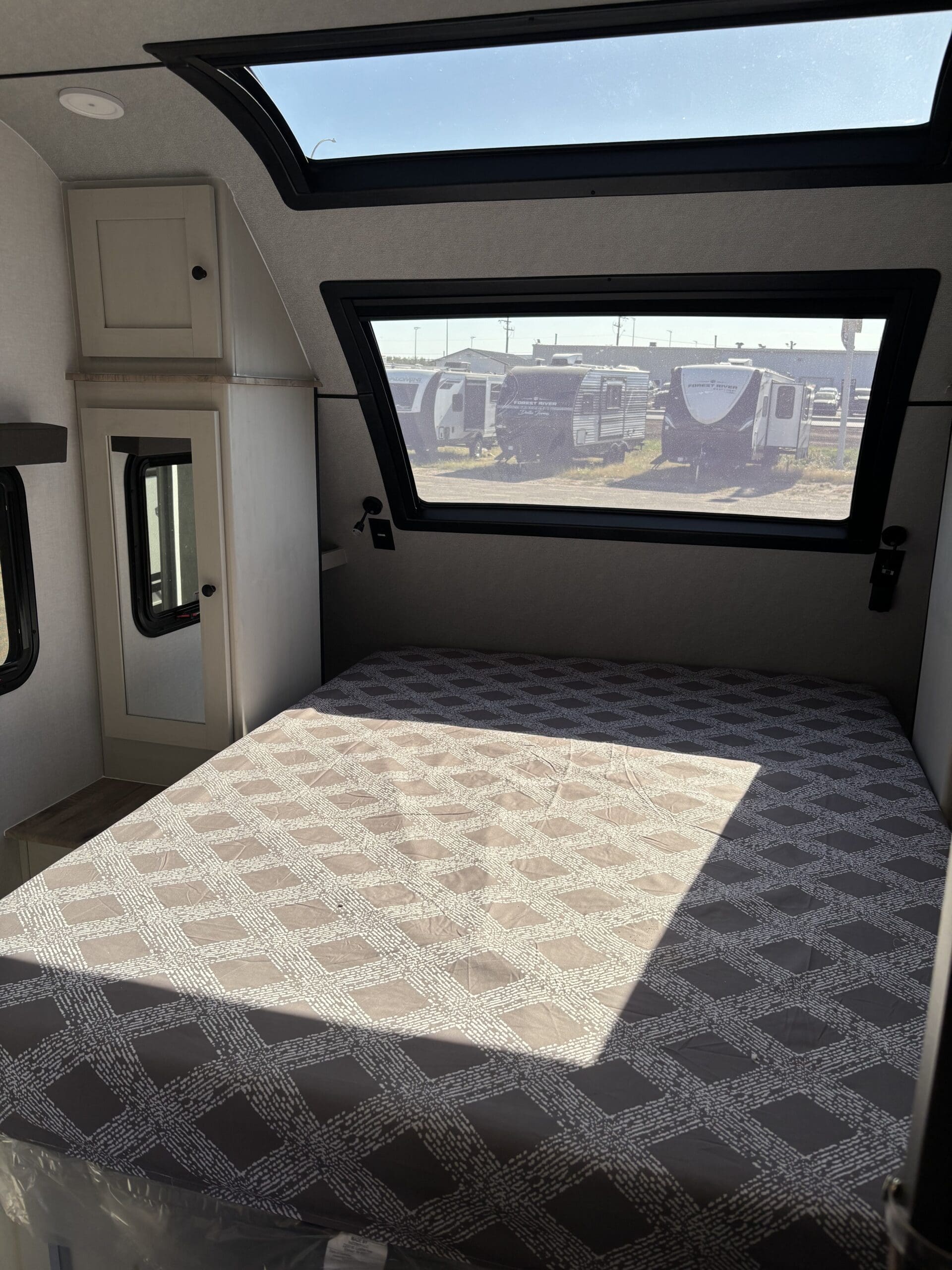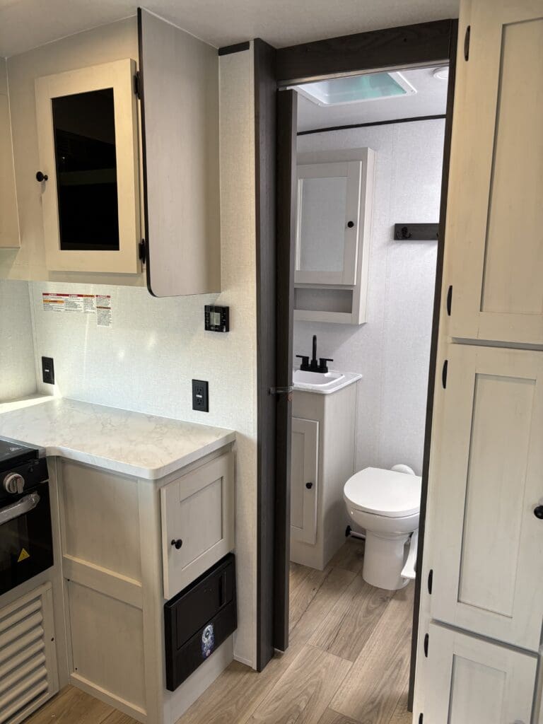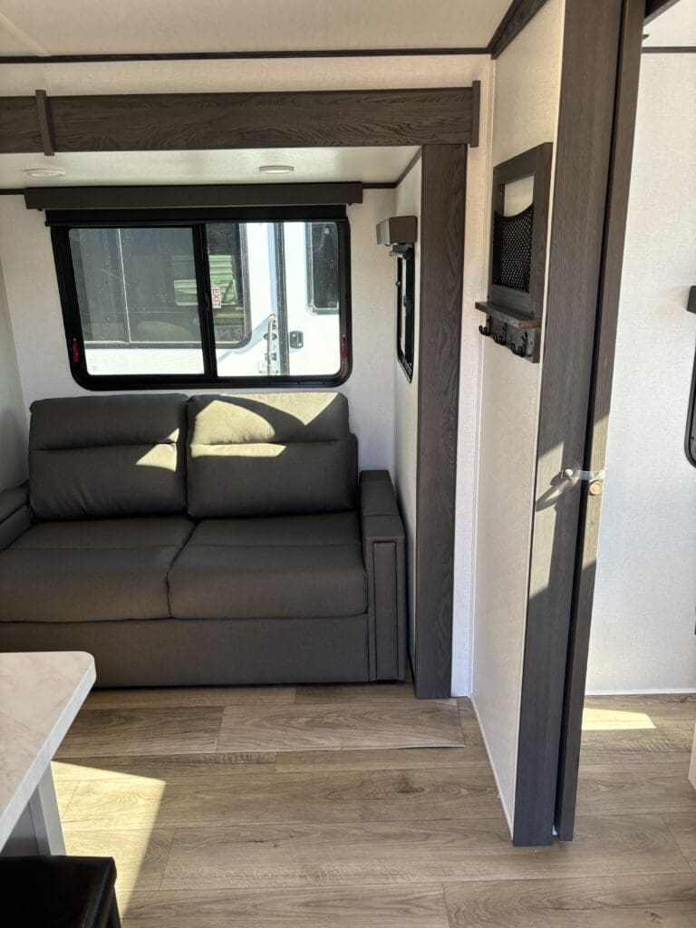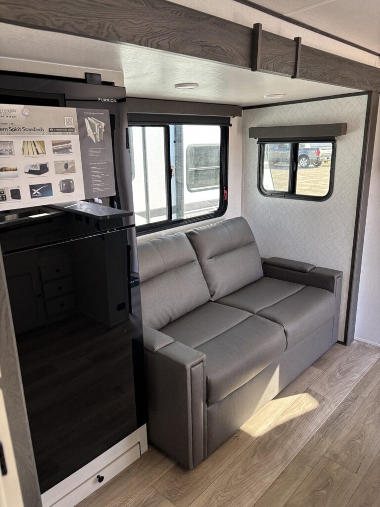 This wide open floorplan includes a deep slide with Theater Seats and Direct View Entertainment, as well as a large L-shaped bar top with residential style chairs. The 2353 feels huge with the bedroom doors opening up to the all new “Skyview” Front Cap.