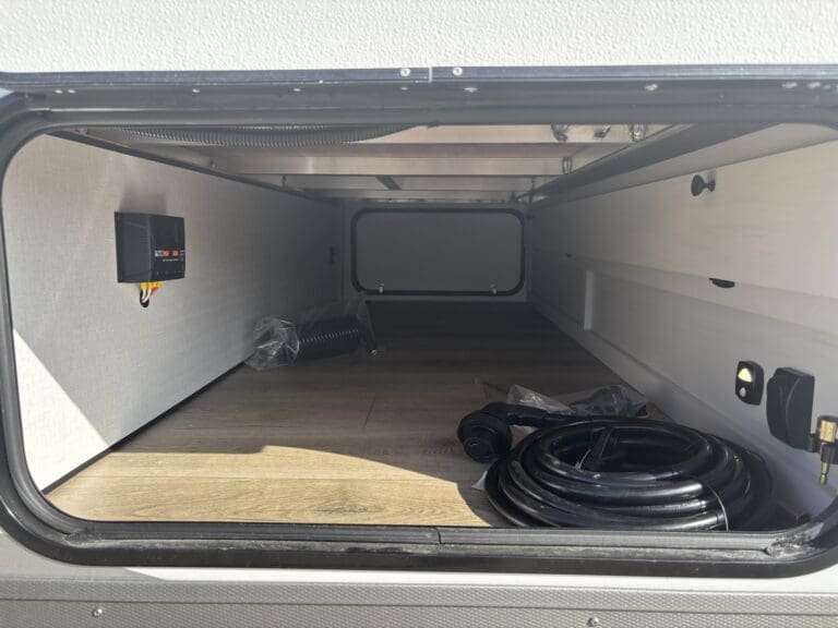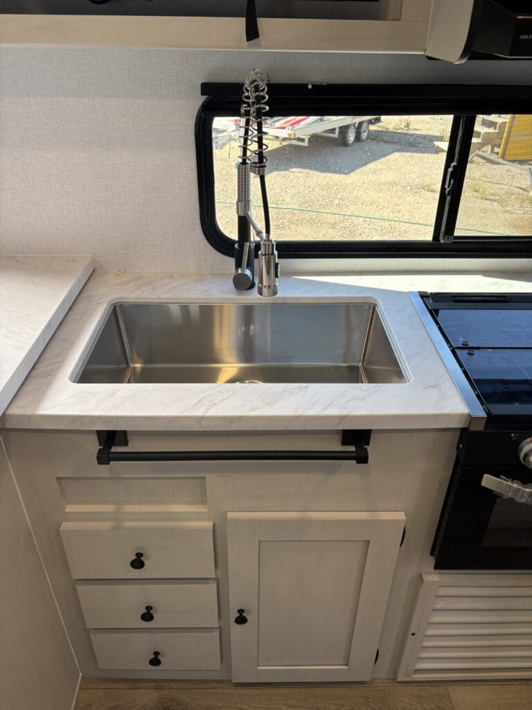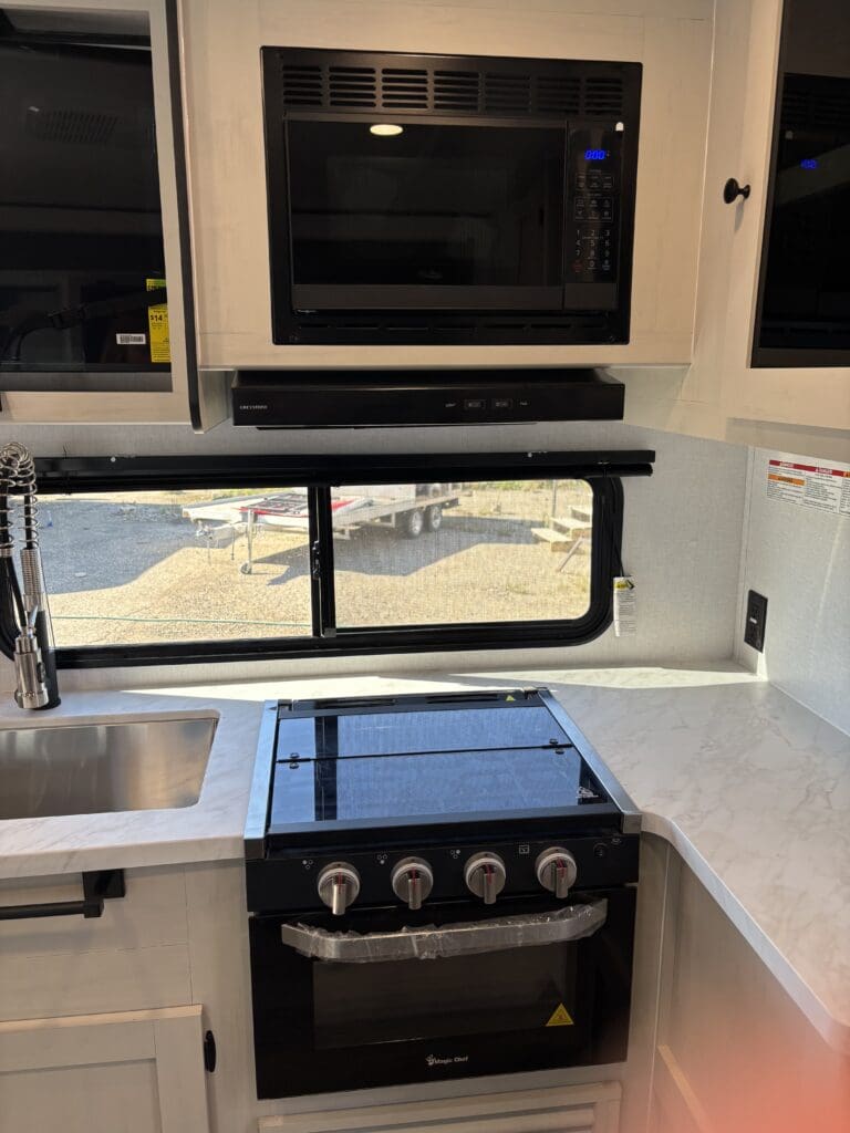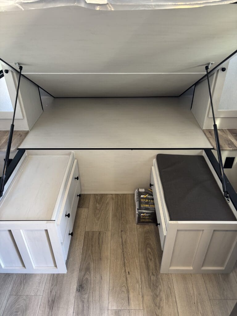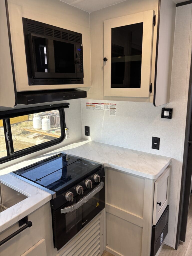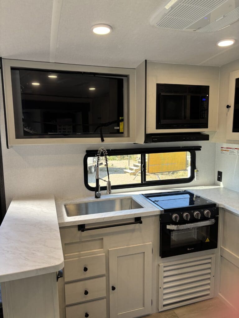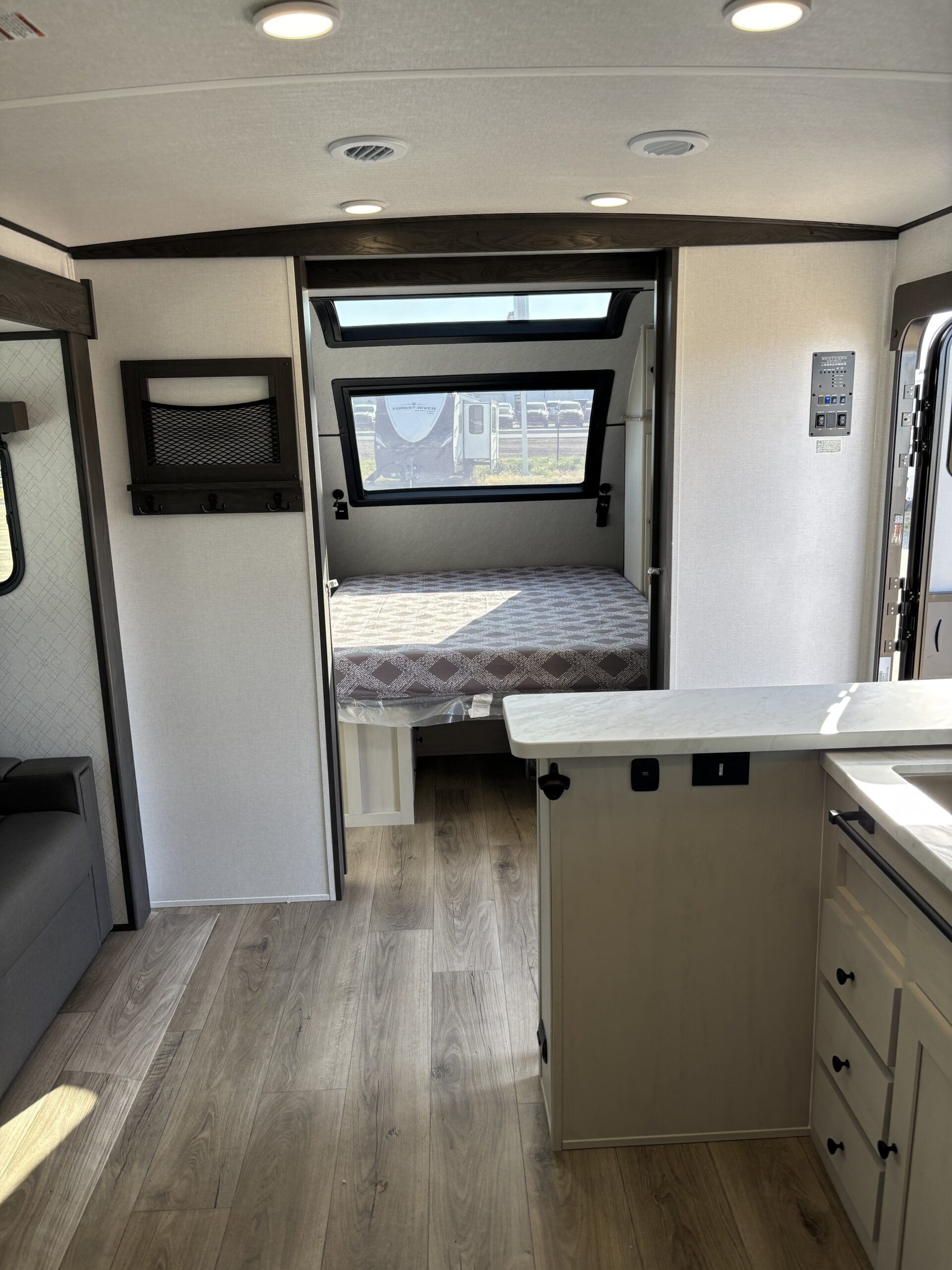 This wide open floorplan includes a deep slide with Theater Seats and Direct View Entertainment, as well as a large L-shaped bar top with residential style chairs. The 2353 feels huge with the bedroom doors opening up to the all new “Skyview” Front Cap.