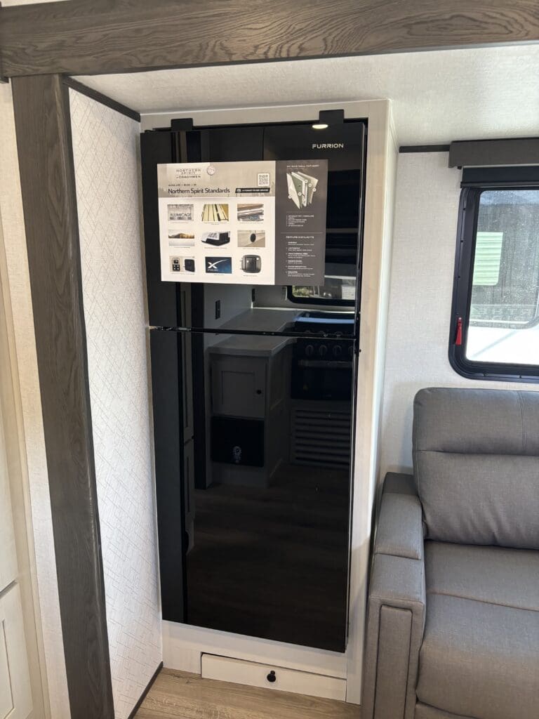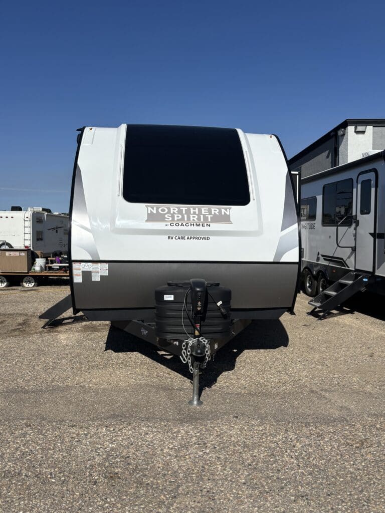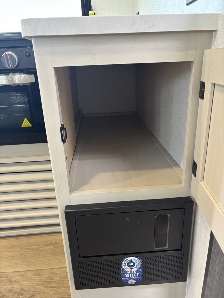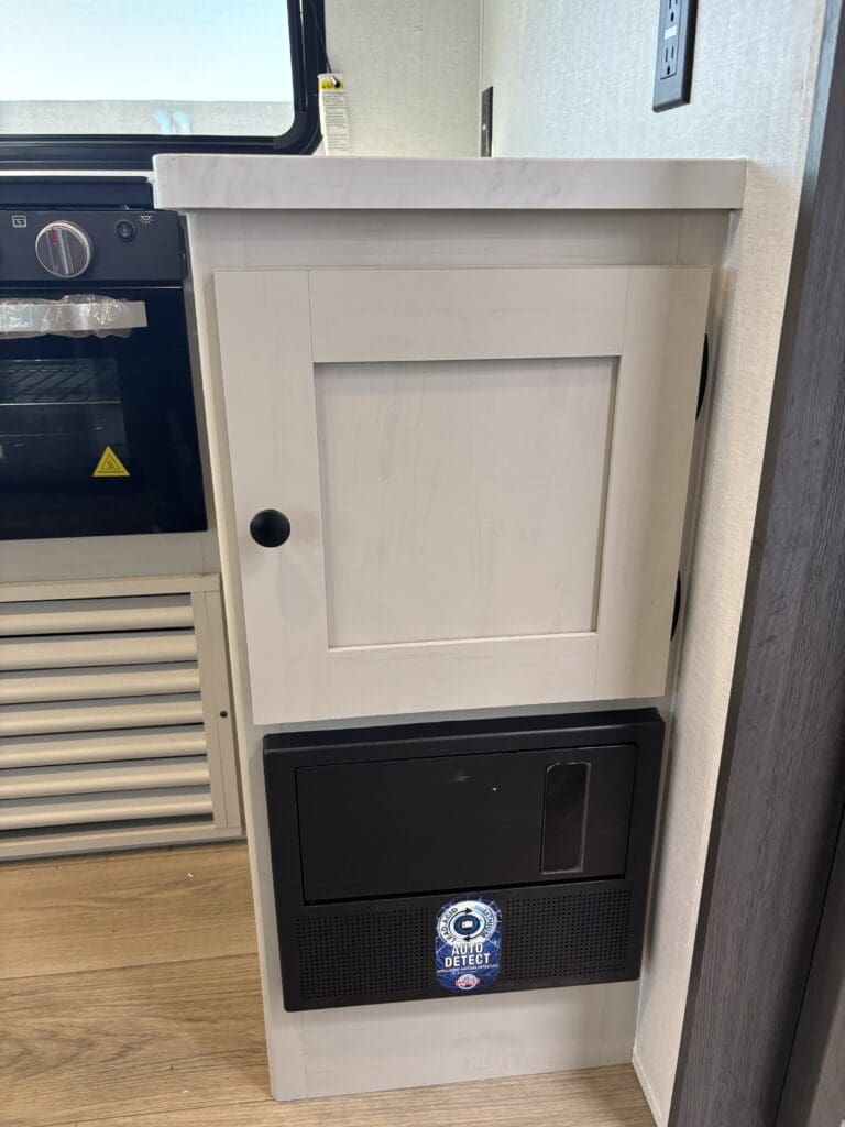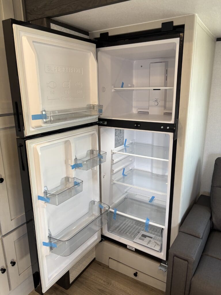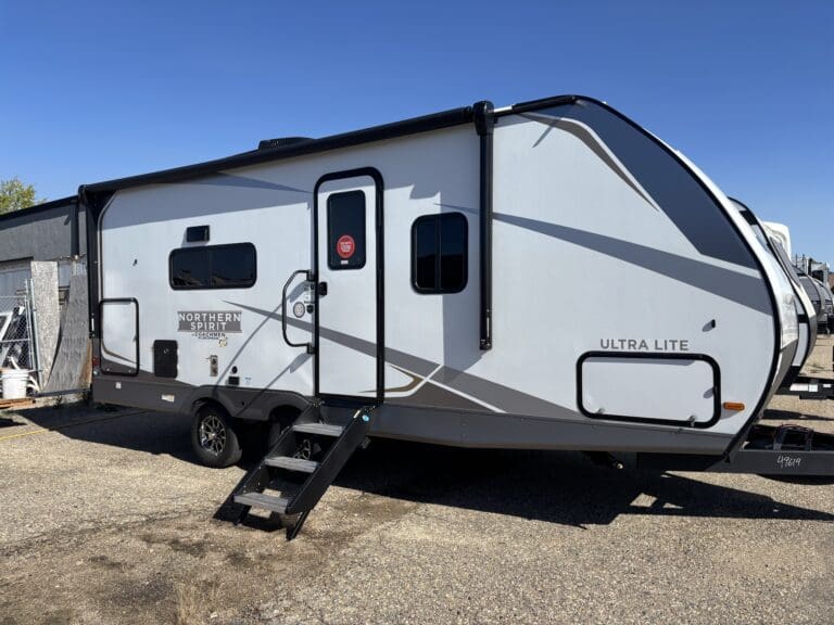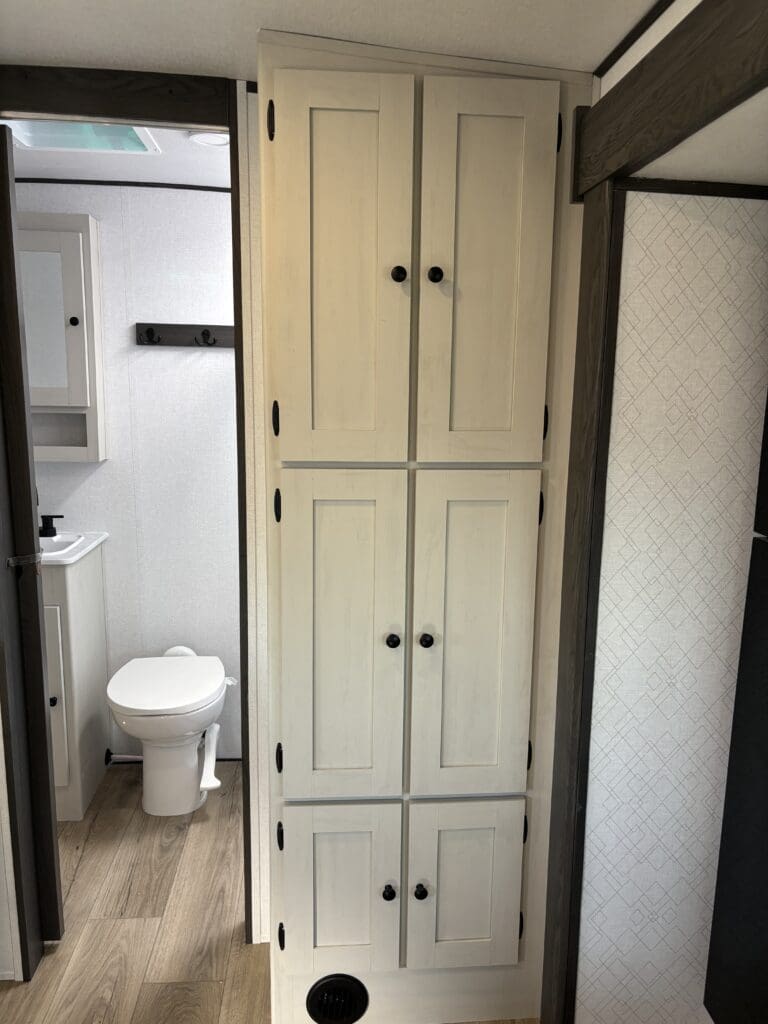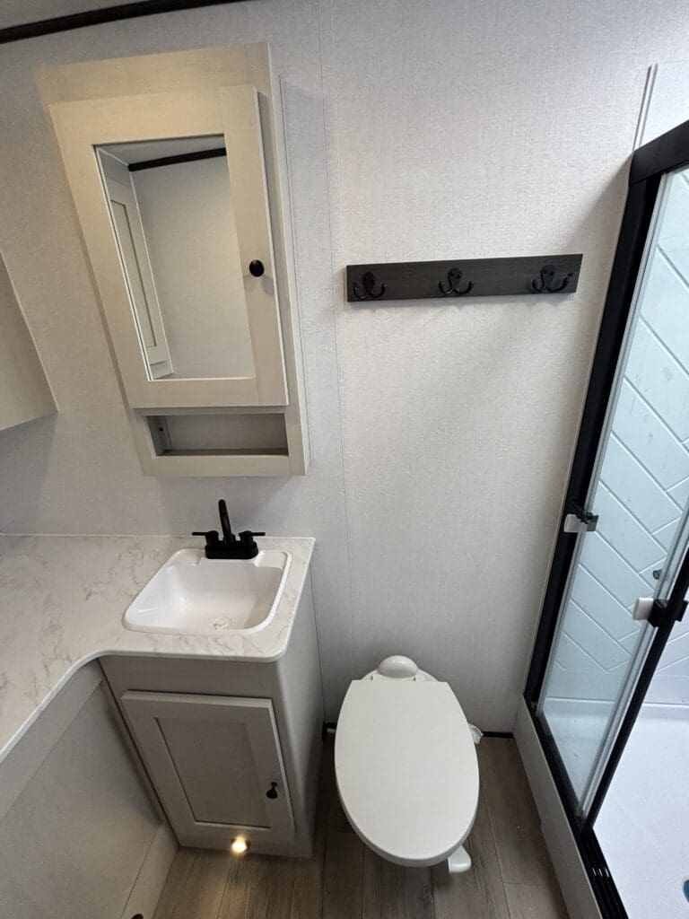 This wide open floorplan includes a deep slide with Theater Seats and Direct View Entertainment, as well as a large L-shaped bar top with residential style chairs. The 2353 feels huge with the bedroom doors opening up to the all new “Skyview” Front Cap.