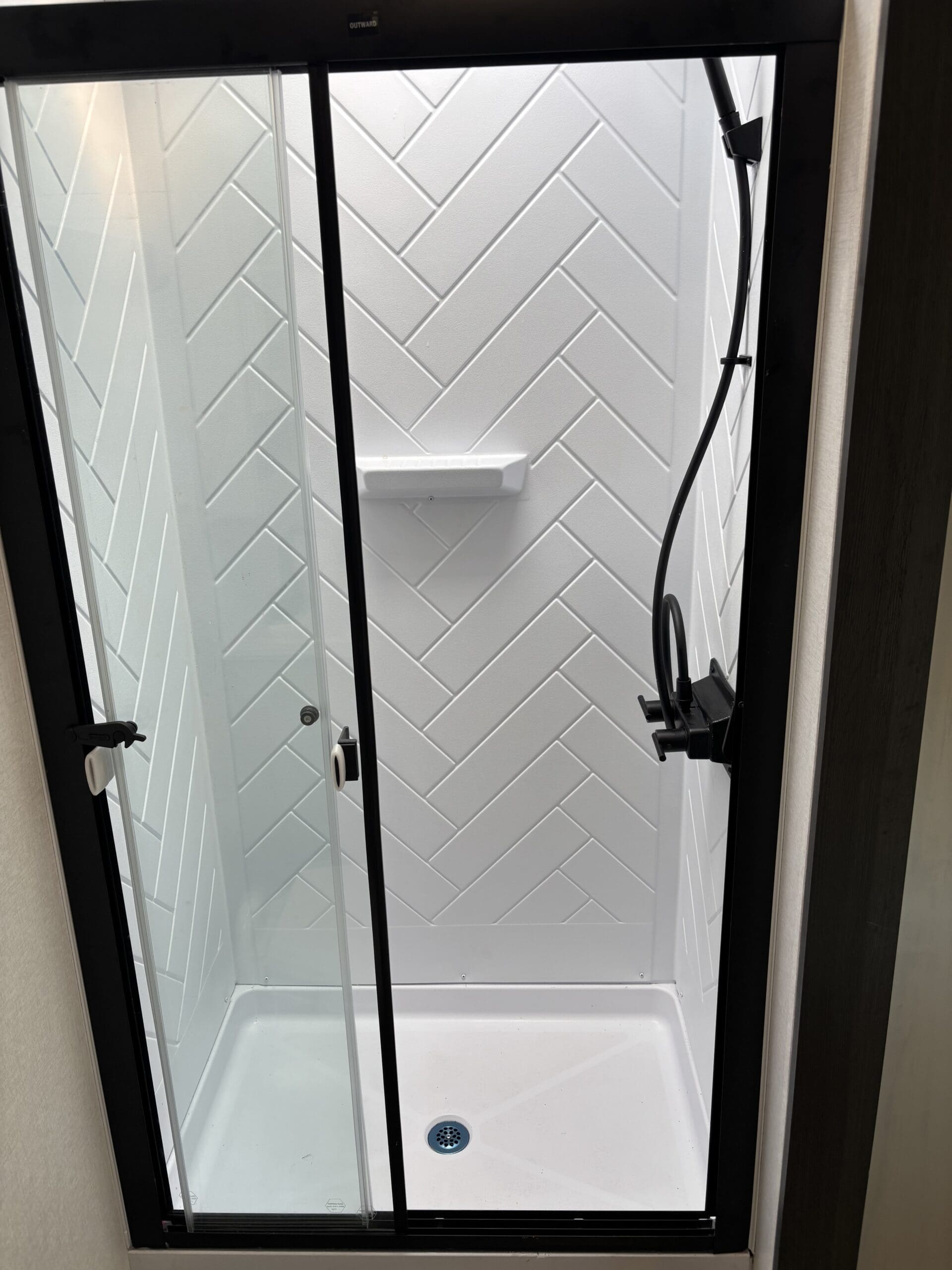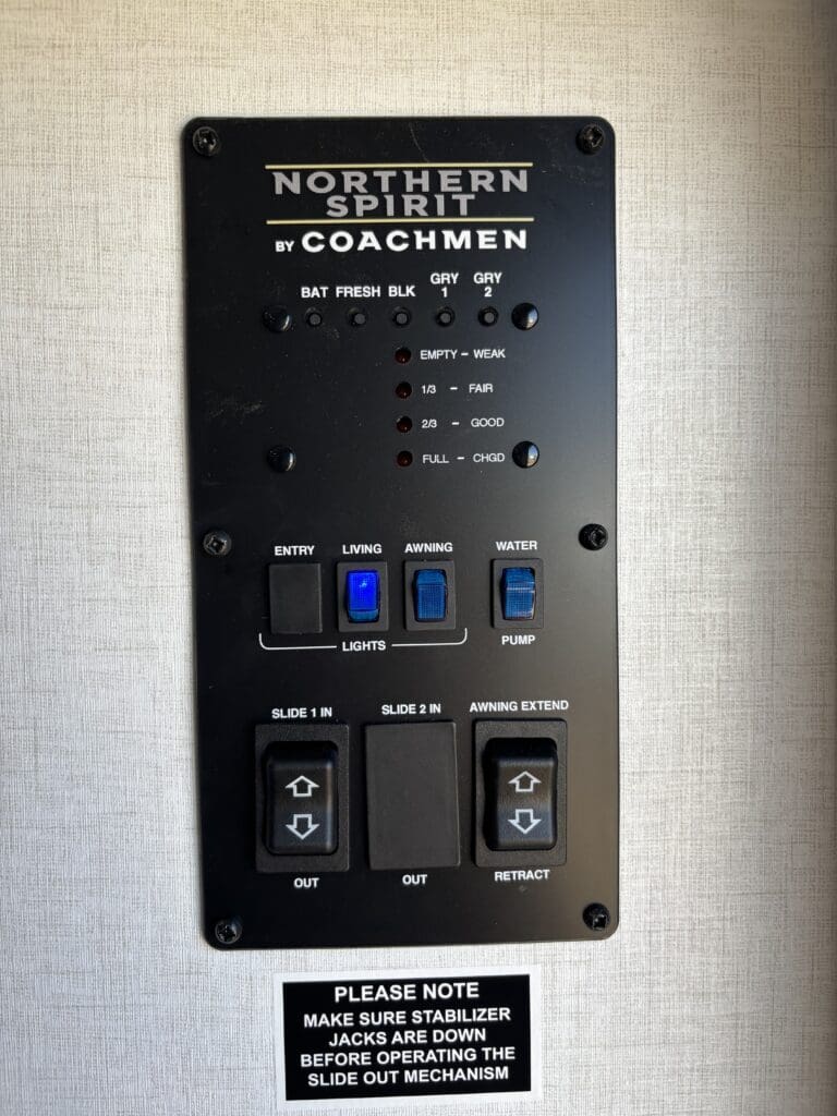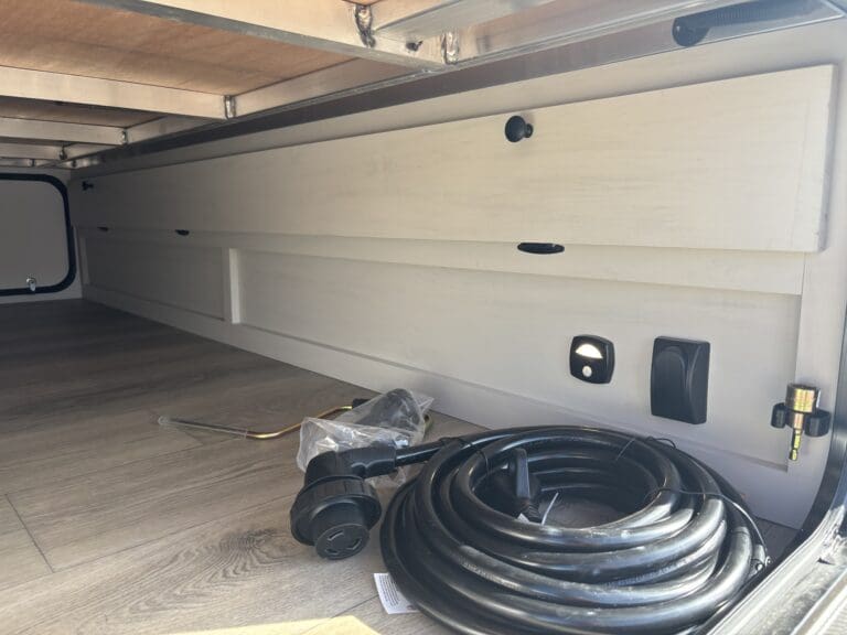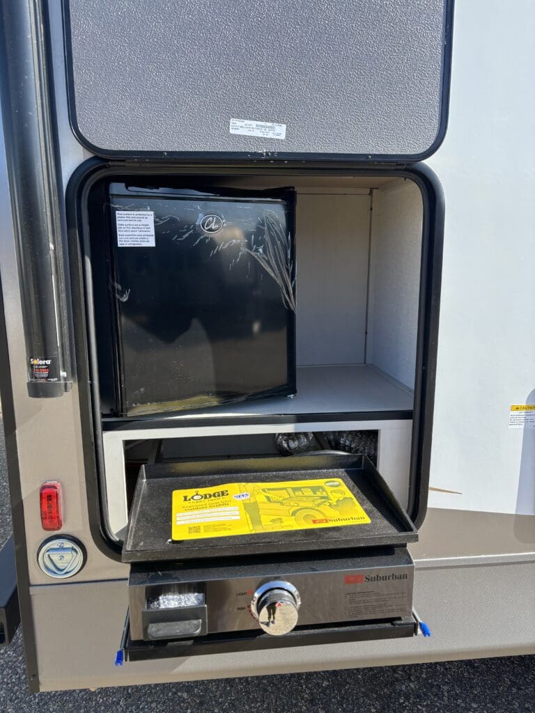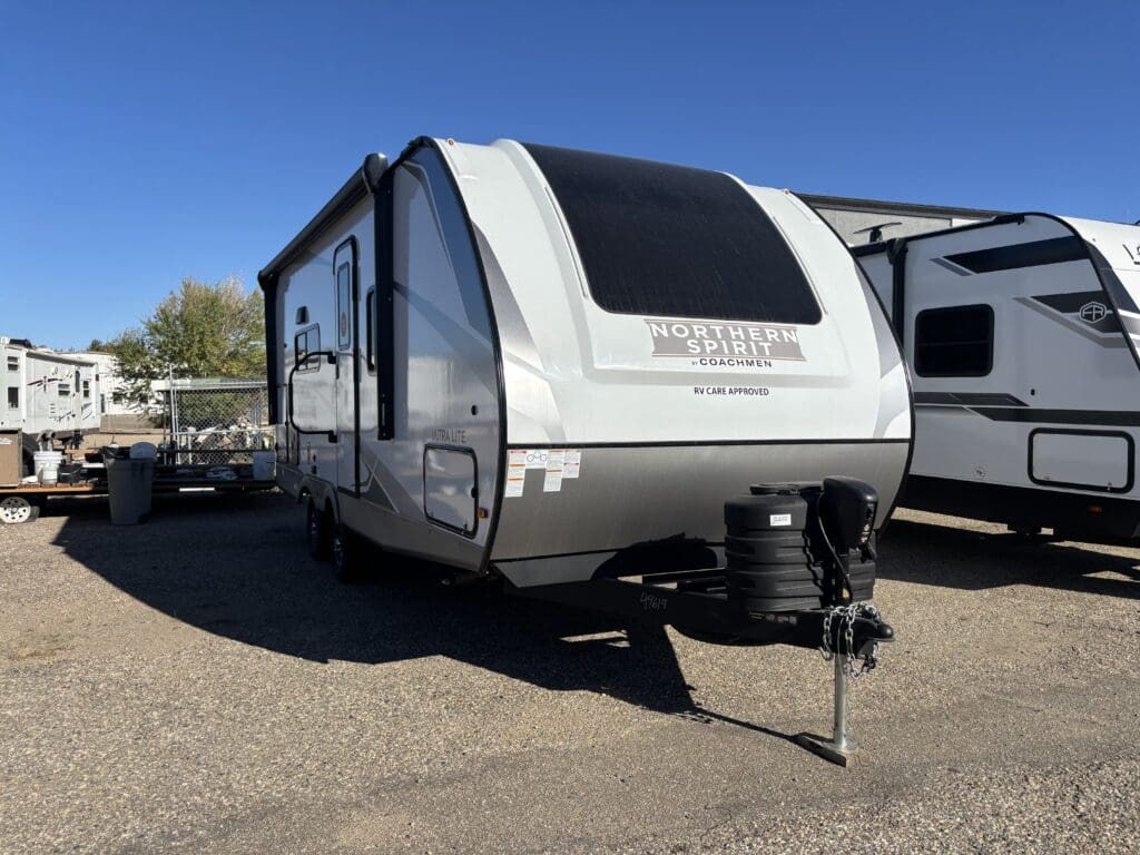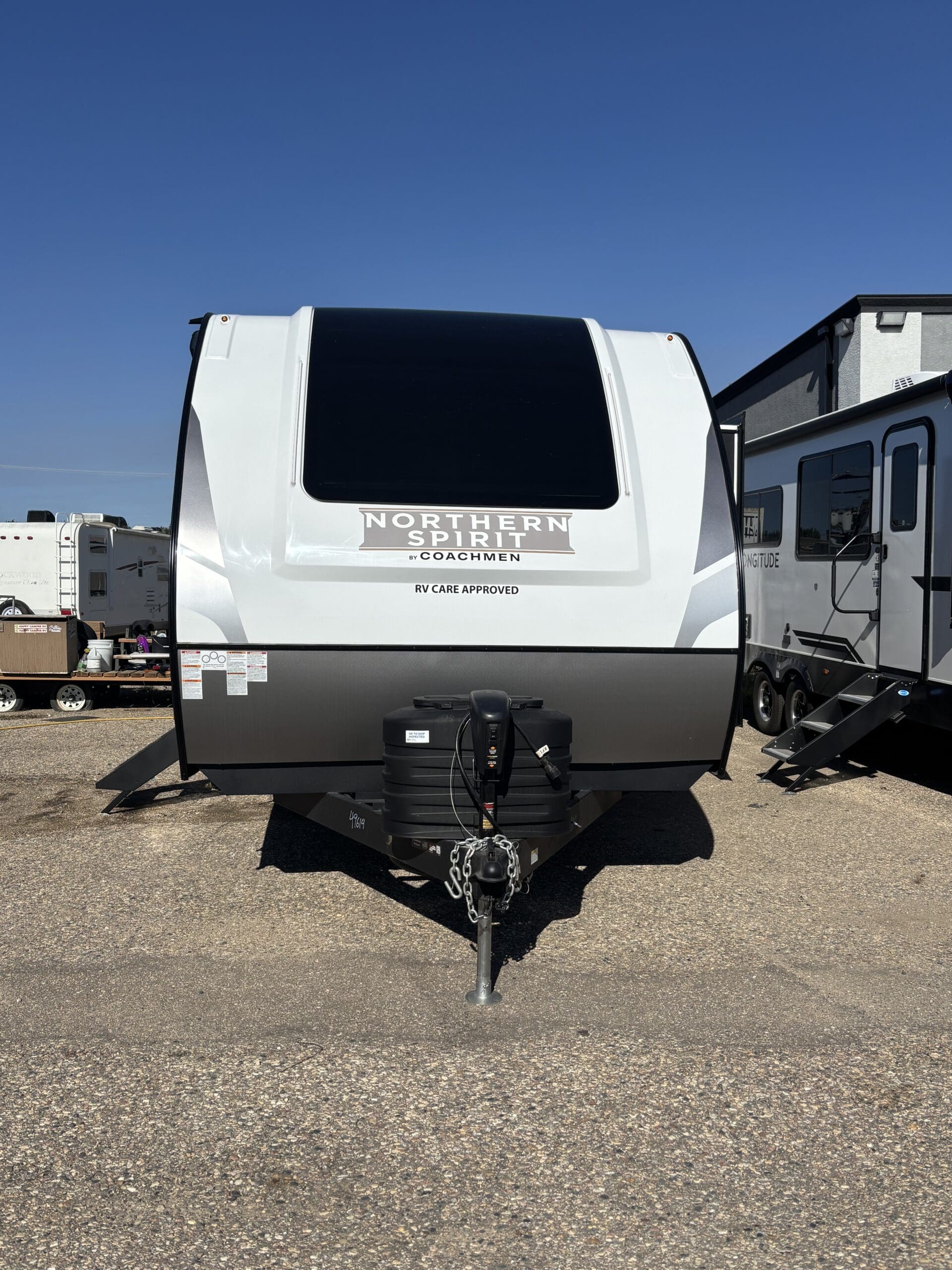 This wide open floorplan includes a deep slide with Theater Seats and Direct View Entertainment, as well as a large L-shaped bar top with residential style chairs. The 2353 feels huge with the bedroom doors opening up to the all new “Skyview” Front Cap.